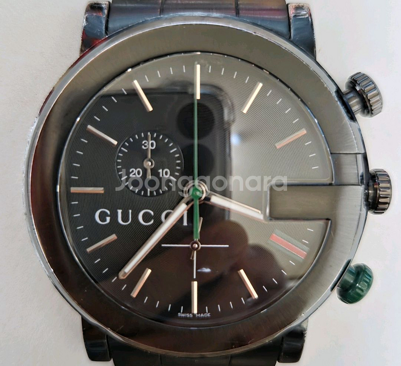 **구찌 G크르노 시계 44mm YA101331** 보증서, 여분줄, 메뉴얼북등 구성품 박스채 그대로 있으며 사파이어 유리의 콕 기스, 시계 바디에 기스 조금씩 있으며 양호한 컨디션 입니다. 최근에 배터리 교체하며 이상 없다는 점검 완료 했고 크르노 기능등 잘작동하며 44mm 사이즈, 블랙 칼라 디자인으로 존재감 탁월합니다.