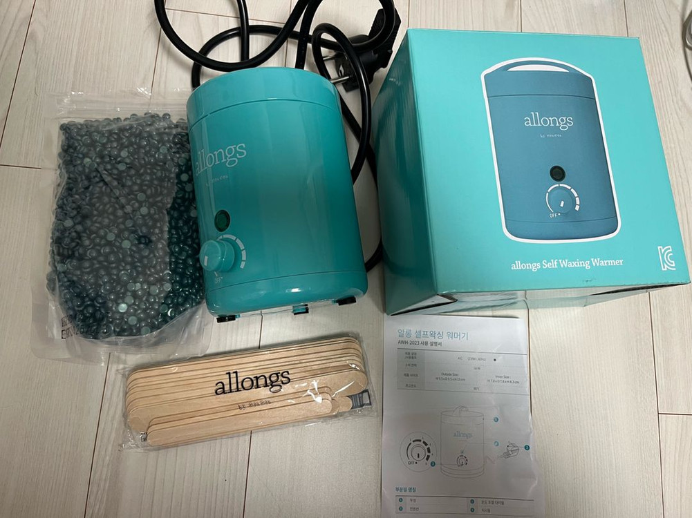 알롱 셀프 왁싱 워머기 세트입니다 민트색 왁싱 워머기와 왁싱 비즈, 스틱이 포함되어 있습니다 집에서 간편하게 왁싱을 할 수 있습니다. 한번 사용