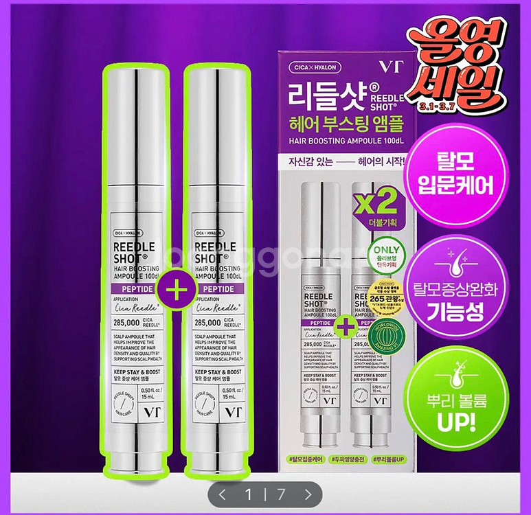 VT 리들샷 헤어 부스팅 앰플 100ml입니다 - 탈모 증상 완화에 도움을 줄 수 있습니다 - CICA와 HYALON 성분이 함유되어 있습니다 - 자신감 있는 헤어 볼륨을 선사합니다