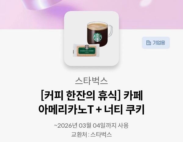 스타벅스 아메리카노+너티쿠키 세트입니다 거래내역다수 다른걸로 교환해서 드실수도 있어요 유효기간 26년 3월 4일까지입니다
