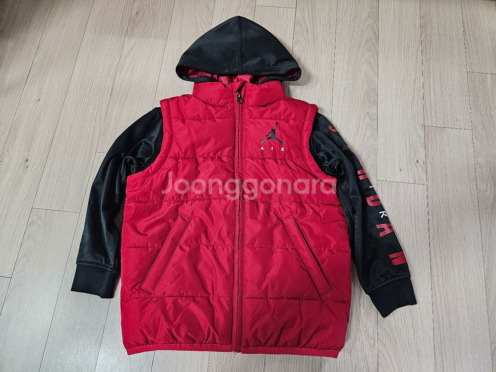조던키즈 패딩조끼 레이어드로 되어있는 점퍼입니다. 붙어있는 상품이에요~ 미국사이즈 5~6y로 키110~116cm용이라 한국사이즈로 120쯤 될것입니다.