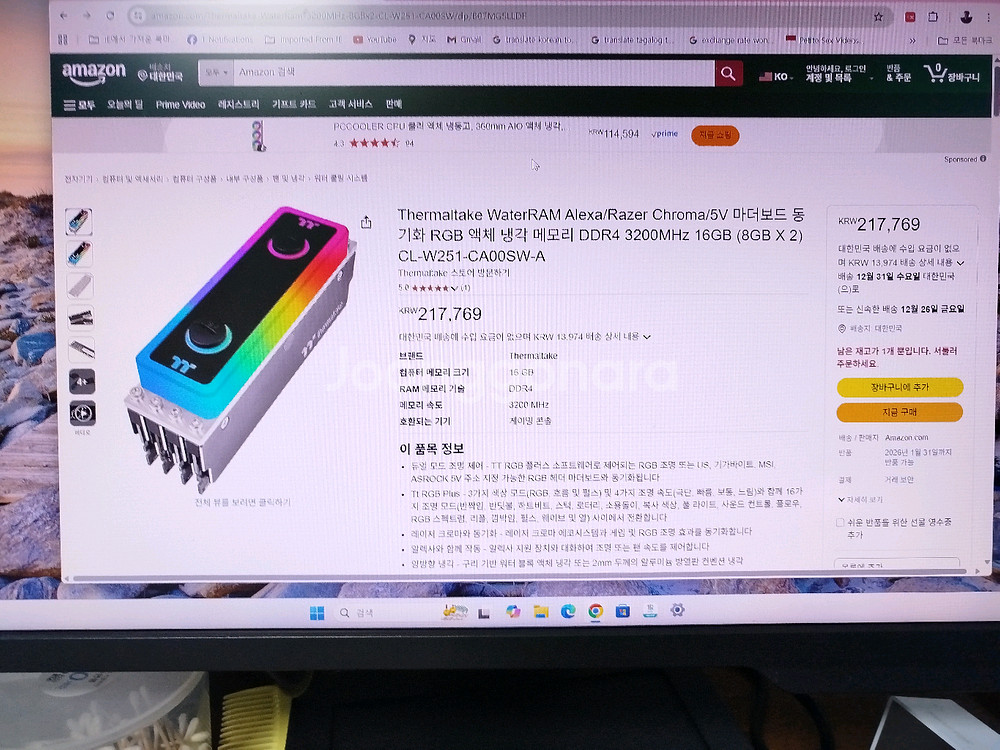 Thermaltake WaterRam Alexa/Razer Chroma DDR4 3200MHz 16GB (8GB x 2) 램입니다 - 액체 냉각 기술이 적용되어 뛰어난 냉각 성능을 제공합니다 - RGB 조명 효과로 시스템을 멋지게 꾸밀 수 있습니다. 2개의 엑스트라 메모리 방열판 킷도 포함되어 있읍니다. 새상품 입니다. 선물 받았는데 제가 쓰기에는 너무 과해서 판매합니다. 전주시