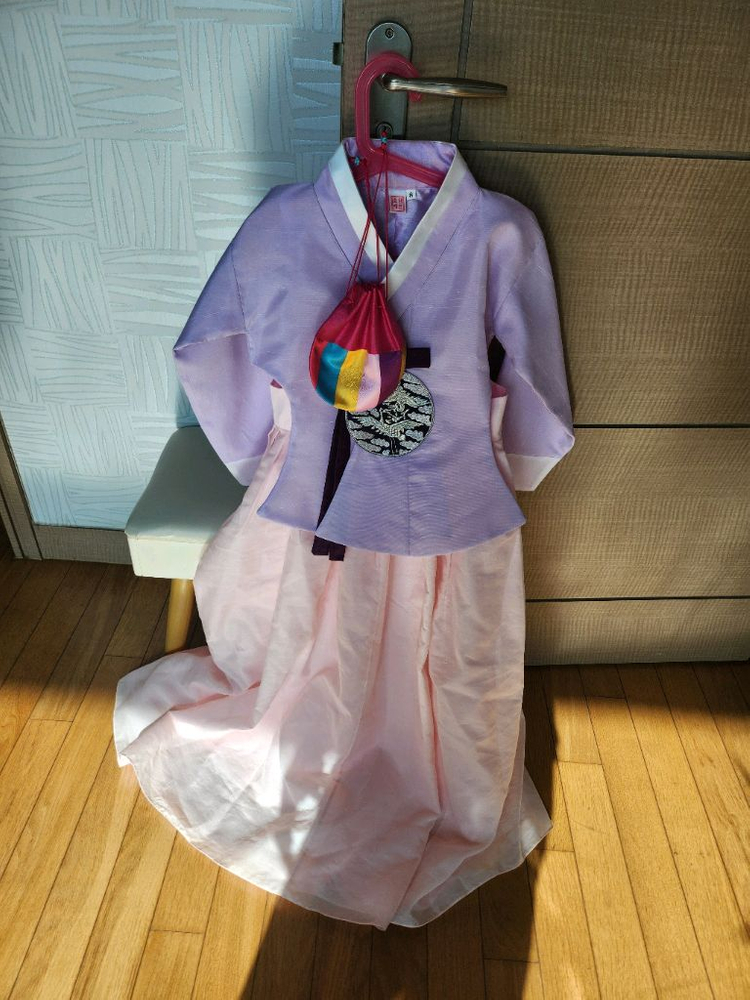 8호 사이즈 여아용 한복이에요. 저고리는 연한 보라색이고 치마는 핑크색으로 예쁘게 조합되어 있어요. 상태 양호하고 특별한 날 입히기 좋을 것 같아요.