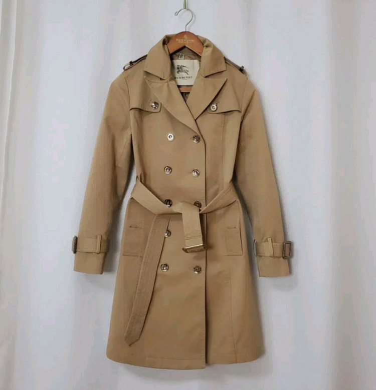 버버리 정품 카멜베이지 UK4 (55) 가슴반품 42cm 어깨부터 총길이 92cm 코튼 봄가을용 카라 소매 깨끗합니다 오염 하자없이 깨끗합니다 왼쪽 주머니 단추 하나 분실