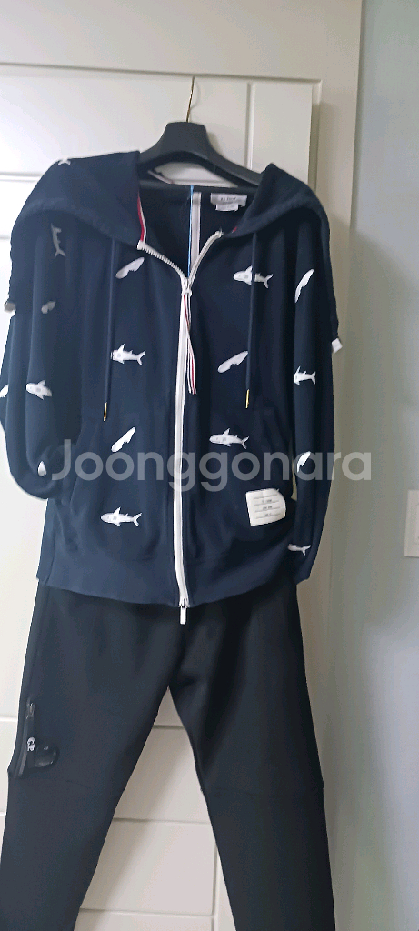 톰브라운상어집업과 바지 세트예요. 네이비 컬러에 화이트 상어 패턴이 포인트로 들어가 있고, 사이즈는 4번입니다