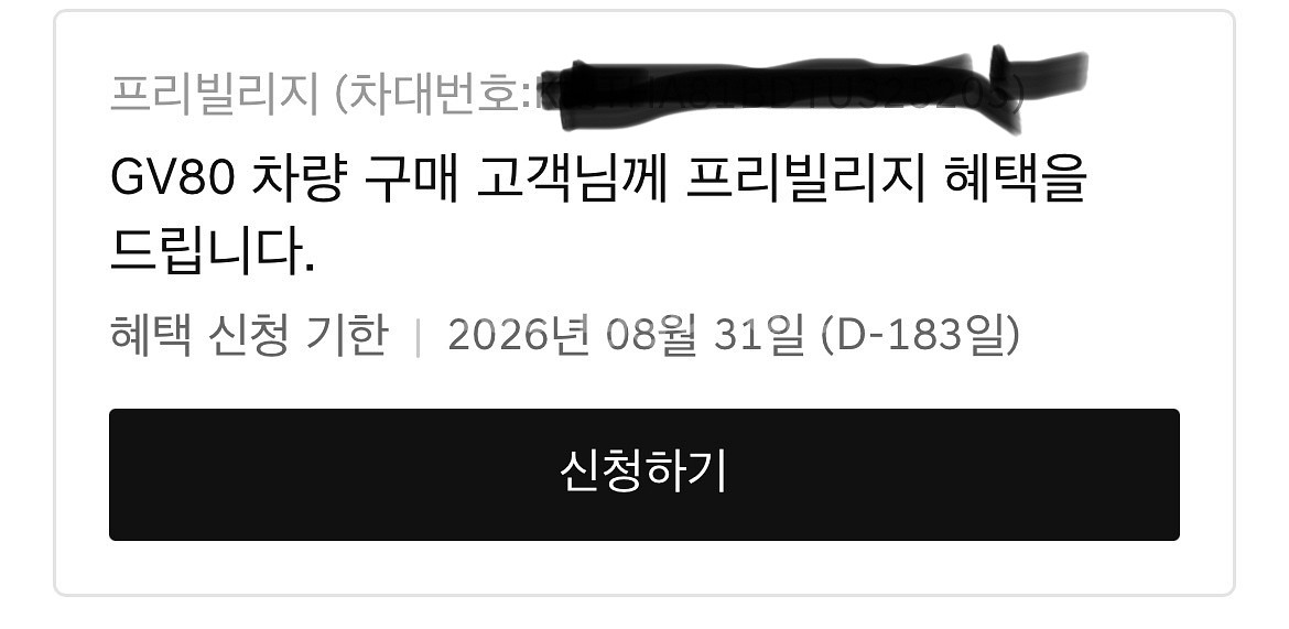 GV80 구매 고객님께 드리는 프리빌리지 혜택입니다 혜택 신청 기한은 2026년 8월 31일까지입니다 제네시스 gv80 프리빌리지 양도합니다. 선입금 후 배송 정보 주시면 등록해 드리겠습니다.