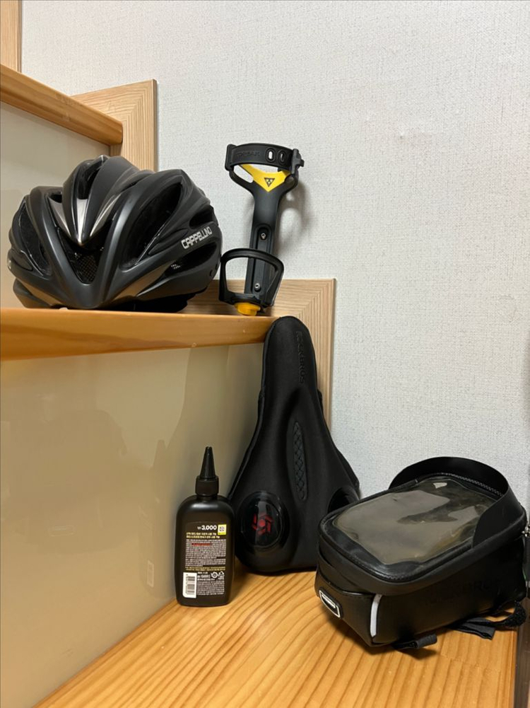 약 8-9만원 상당 자전거용품 일괄로만 판매합니다. 괄호 안은 구매가 입니다 특이사항 및 사용감은 사진 확인해주세요 전제품 알콜세척 완료 1. 카펠리노 헬멧 (3.0) - 충격받은적 없으며 약간의 사용감 외 깨끗합니다. 2. 탑픽 물통 및 스피커 거치대 (2.0) - jbl filp4 스피커 딱맞아요. 사용감 외 깨끗합니다. 3. 락브로스 가방 및 휴대폰 터치 거치대 (1.5) - 폰넣고 터치 조작 가능. 공구틀 등 보관 가방 - 자전거에 고정되는 앞쪽과 튀어나온 옆쪽에 마모가 있습니다. 사용에는 전혀 문제없습니다. 4. 락브로스 실리콘 젤안장 커버 (2.0) - 전립선 패드 바지 입기 귀찮은 분들 추천 - 앞쪽 구멍이 살짝 있으나 고정 전혀 문제없고 깨끗합니다. 5. 다이소 자전거 체인오일 (0.3) - 1월 초 구매 후 한번 사용 당분간 직거래는 약수역만 가능합니다 구매 후 환불 불가합니다
