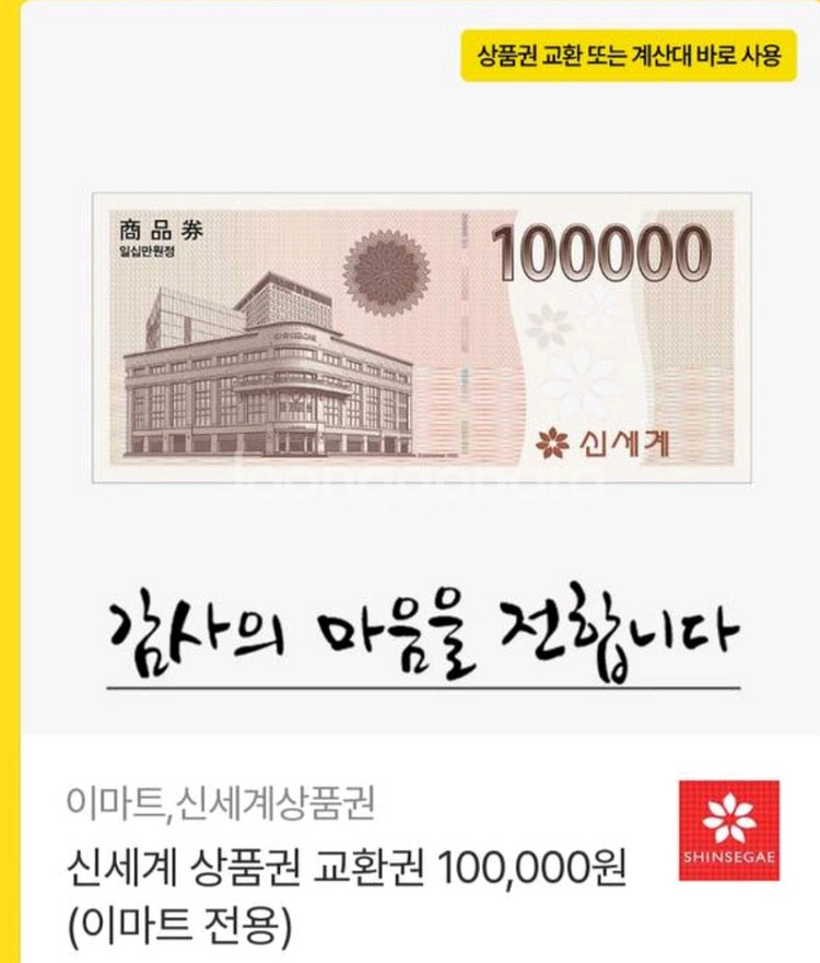 신세계 상품권 교환권 10만원권이에요. 이마트에서 사용 가능해요 유효기간 27년 2월16일까지