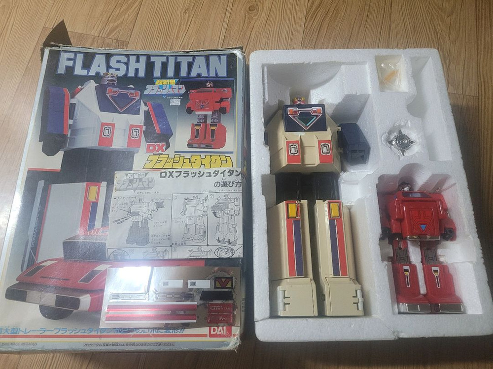 반다이 dx 플래시타이탄, 국내명 후뢰시타이탄 입니다. 86년도 제품이라 고질적 황변과 사용감 있습니다. 그레이트타이탄 한쪽 무릎은 고정이 좀 약하네요. 분실은 없고, 커스텀 스티커 같이 보내드립니다. 상태 감안, 택포 100만원. 네고X 직거래는 인천 부천 서울 신도림 부근까지 가능.