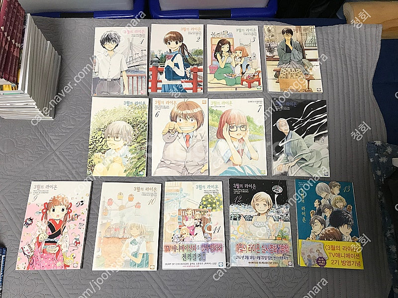소장용 만화책 코믹스 3월의 라이온 1~13권 일부 초판, 이벤트 포스트 카드 포함 판매합니다. (만화 허니와 클로버 작가) 애니메이션으로도 제작된 작품입니다. 전권 직접 새 책 구매 후 비닐만 뜯고 한 번도 읽지 않고 상자에 보관만 했습니다. 6, 8, 10, 11, 12, 13권 초판이며, 13권 SNS 이벤트 당첨품인 포스트 카드 세트도 있습니다. 전권 소장용 상태이지만, 읽지 않았다고는 해도 표지 자체가 코팅이 안 된 종이 재질 표지라 서점 구매 때부터 외관상 약간씩 찌그러지거나 닳은 흔적이 몇 있으니 양해 부탁드립니다. 그중에서도 눈에 띄는 6권 종이 부분과 11권 책등 부분 찌그러짐 사진 참고 부탁드립니다. 인터넷 서점 기준 1~13권 판매 가격이 93600원인데, 포스트 카드 세트 포함하여 더 저렴하게 8만원에 판매합니다. 택비는 별도 6천원입니다.