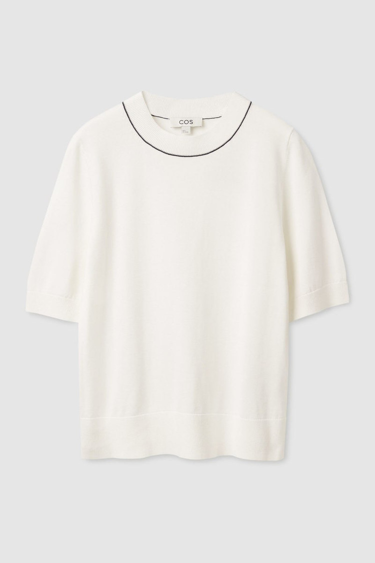 가슴 44 기장 58 아이보리 색상의 코스 반팔 니트입니다. XS 사이즈로, 여성분들께 잘 맞을 것 같아요. 목 부분에 검정색 라인으로 포인트가 들어가 있습니다. 깨끗한상태입니다 :)