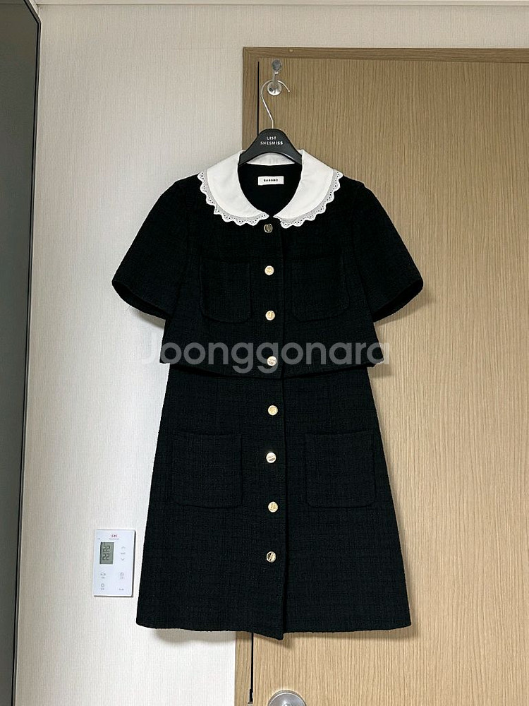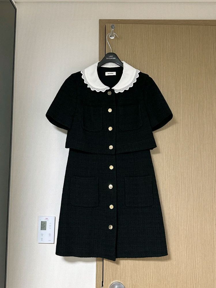 산드로 콘트라스트 카라 쇼트 드레스 SFPRO01916 손연재 하객룩으로 유명한제품 파페치에서 직구한 제품 카라부분 이염 등 사용감 사진 참고해주세요 여분 버튼 1개 있음 여성 55사이즈 적당합니다 사이즈 36