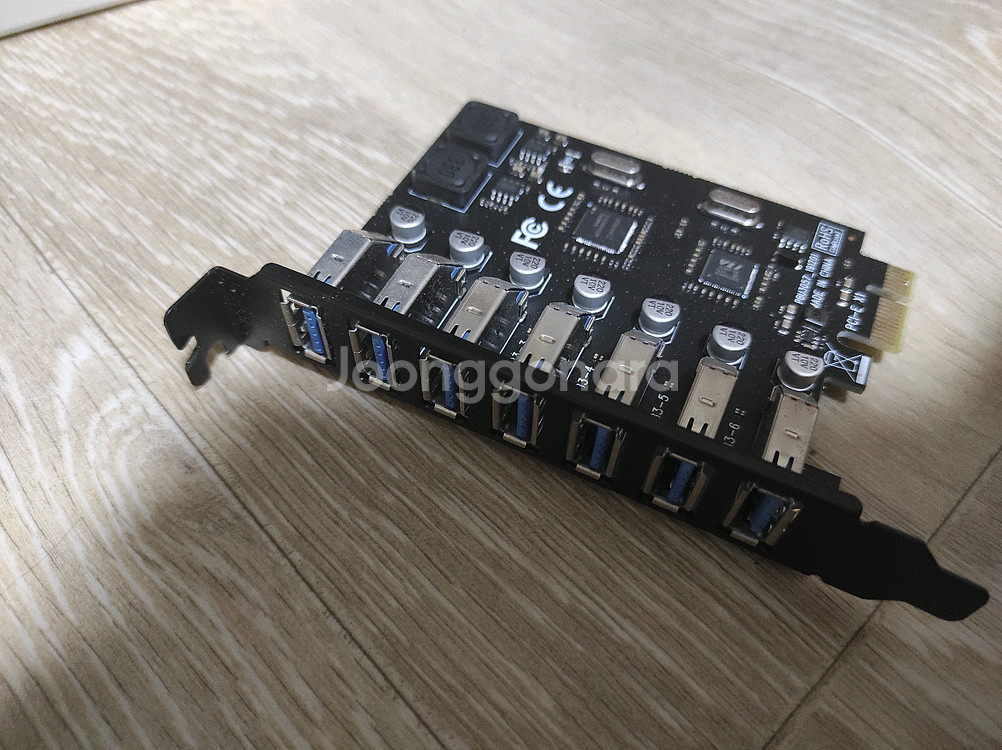 PCI express용 7포트 USB 허브입니다. 얼마 사용하지 않은 거의 새 제품입니다. 포트가 수직인데 본체 뒤편 PCI 슬롯 상하 폭이 딱 USB 연결할 만큼만 돼서 넣고 빼는 게 뻑뻑할 수 있고, 추가 전원이 없으므로 전력 소모가 많은 기기 여러 개를 동시에 연결하면 전력이 부족할 수 있습니다. 윈도 10 이상이 아닌 운영체제에서의 작동은 보장하지 않습니다.
