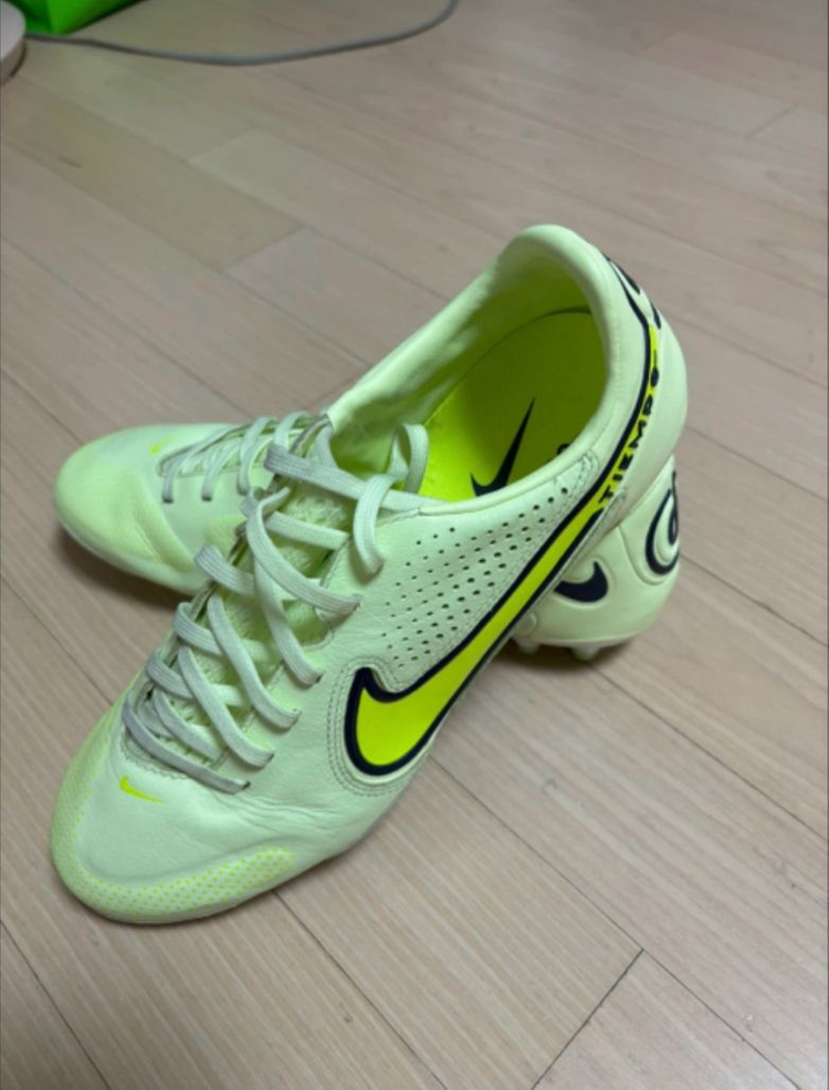 나이키 티엠포 인조잔디 전용 축구화 팝니다 265사이즈고 본인 운동화 사이즈 270인데 타이트하게 딱 맞아요 실착 풋살 2경기 패스 연습까지 3번 착용했습니다 *상태는 사진 참고* 정가 249000원에 에프에이 사커에서 구매했습니다 상자X 축구화 주머니랑 신가드도 같이 드립니다 *택포가격입니다* *현재는 단종된 모델* 편하게 채팅 주세요🙏
