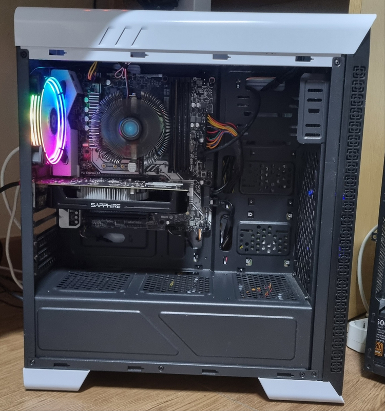 CPU i5-7600 (CPU쿨러 잘만쿨러) MB ASRock B250M PRO4 RAM 삼성 DDR4 8GB (8G x 1) GPU 라데온 RX 460 2G SSD 120GB HDD 노트북용 1TB 파워 파워렉스 REX3 500W V2.3 케이스 대양케이스 ENIX USB 3.0 풀 아크릴 미들타워 OS 윈도우10 제품 테스트 완료 CPU 써멀구리스 재도포 및 전체적으로 청소 완료 메인보드가 메리트가 많습니다. RAM 슬롯 4개, 그래픽카드 2개, Ultra M.2 2개 장착이 가능합니다. RX 460은 GTX 1050 모델과 비슷한 정도라고 합니다. 케이스는 고가의 케이스이긴 한데 전면 쿨러 2개 중 1개(아래)가 소음이 있어 돌아가지 않게 분리해놓았고, 찌그러짐이나 스크레치들을 감안하여 가격 산정에 케이스는 없는 것과 같이 하였습니다. 때문에 외관에 예민하신 분이라면 사용하기 어려우실 수 있습니다. 사용에는 이상 없습니다. 추가금 내고 아래 제품들로 업그레이드 혹은 추가구매 가능하니 문의 주시기 바랍니다. GTX 1060 3G GTX 2060 6G RAM 삼성 DDR4 16G / 32G