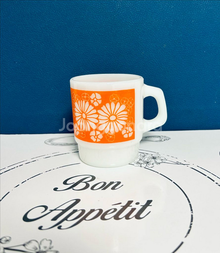 1960년대 중반에서 1970년대 중반 사이에 미국 앵커 호킹사에서 생산된 정품 파이어킹 머그입니다. 아 제품은 뽀얀 우유 빛깔 밀크글라스 위에 선명한 오렌지색 꽃무늬가 포인트인 '데이지' 패턴으로, 홈카페용으로 인기가 매우 높은 모델입니다.💕 위로 차곡차곡 쌓을 수 있는 스태킹(Stacking) 형태라 보관이 편리하며 인테리어 소품으로도 훌륭합니다. 😊 컨디션 양호한 편이나 사진6에서 처럼 미세한 얼룩있어 가격 책장에 감안했습니다. <사이즈> 컵 입구지름: 7.8cm 높이 8.8cm made in USA ➡️ 밀크 글라스는 제조 특성상 밀림, 줄, 색뭉침, 그림 손상, 표면 스크래치 등 다양한 이슈가 일반적이며, 이는 빈티지 제품의 자연스러운 현상으로 간주됩니다 ➡️ 다른 물건도 함께 올려놓았으니 둘러보세요^^