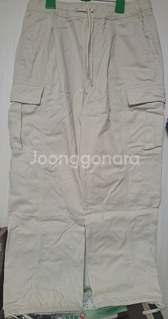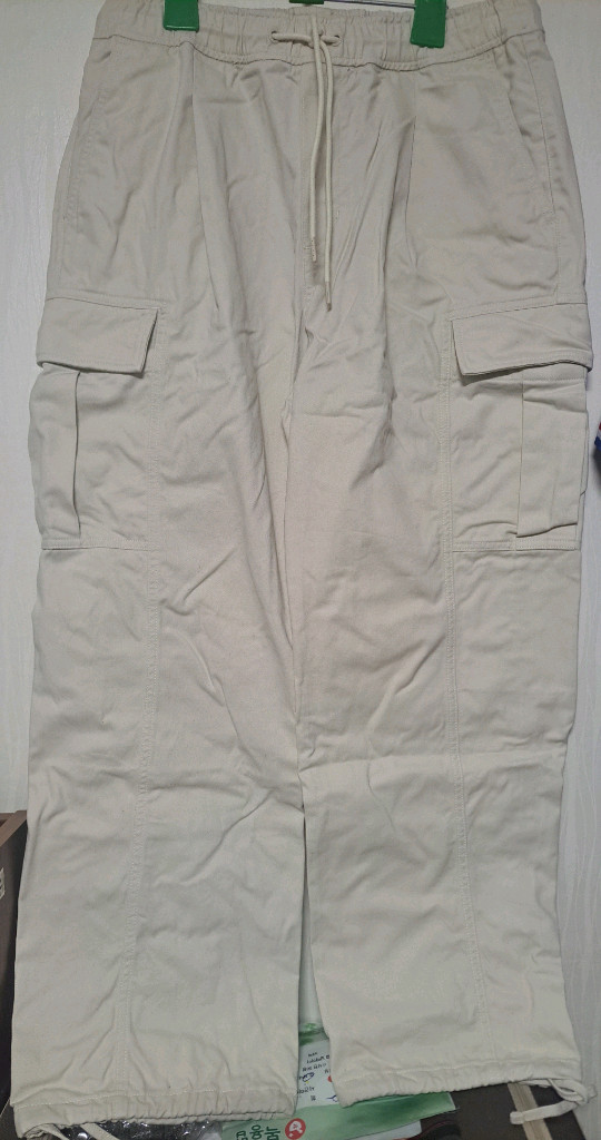 스파오 와이드/조거 카고 팬츠 크림 컬러 L : 정가 49,900원 택/포장채 1회 착용 세탁 보관. 총장102/허리단면40/밑단25cm 가을,겨울용. 청바지처럼 신축성 없고 튼튼하고 두꺼운 면 재질. 허리 조절 스트링/밴딩 32-34 착용 추천. 밑단 조절 스트링으로 조거 스타일도 가능.