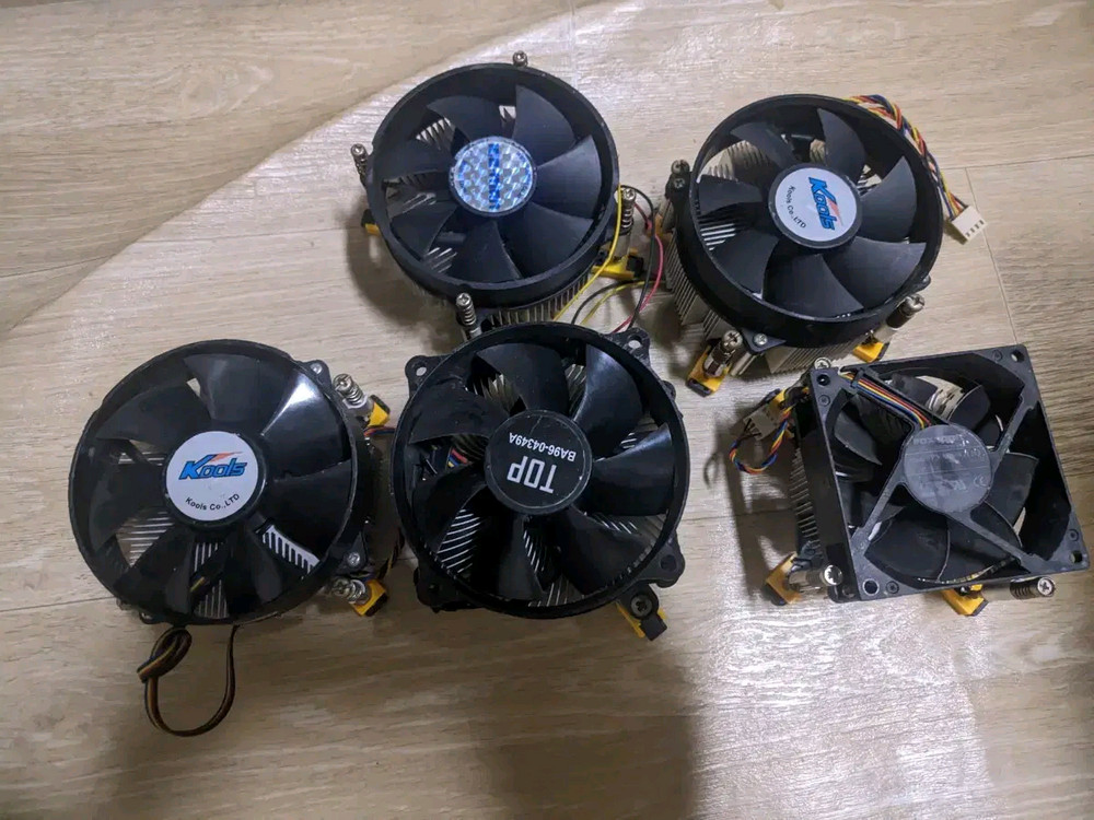 인텔 775 소켓 잘만 쿨러 4개입니다. CNPS80F (3핀) 2개와 정확한 모델명을 알 수 없는 CNPS 쿨러 (4핀, 더 큼) 2개입니다. CNPS80F는 개당 (팔림), 모델명 불명 쿨러는 개당 7000원입니다.