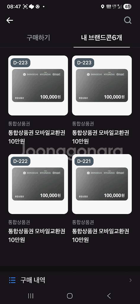 통합모바일상품권 10만원권 판매합니다. 토스뱅크 브랜드콘 가테고리에서 구매함. 총재고 10만원권 6장 있습니다. 사용가능 백화점은 현대백화점. 신세계백화점. 이마트 3곳중 원하는 곳으로 골라서 KIOSK 혹은 고객센터에서 교환해 사용하시면 됩니다. 유효기간 2026. 10. 10 현재 일본 장기출장으로 체류중이니 가급적 중고나라 톡으로 연락요망합니다. 빠른거래 010 9908 8208번으로 문자사용시 데이터로밍만 해놓은상태라 KT로밍 문자요금 발생됨. 실시간재고 - 10만원권 5장
