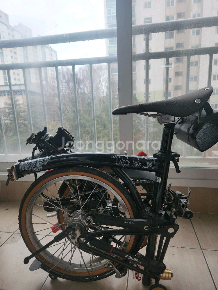 브롬톤 Limited Edition 빅리에요 구하기 쉽지 않은 제품이에요. 전체적으로 사용감은 있으나 관리 잘되기도 했고 수년째 실내에서 보관 해뒀어요 사용감 있는 가방도 같이 드려요. 원래2단인데 6단으로 샵에서 변경했고 다이나모와 앞에 전등도 추가해놓은거에요 기타 여러가지 아이템들 추가해놓은건데 이름이 기억이 안나네요.ㅡㅡ 아시는분이 보시면 알 듯하네요. 싯포스트는 긴걸로 사용중이에요.