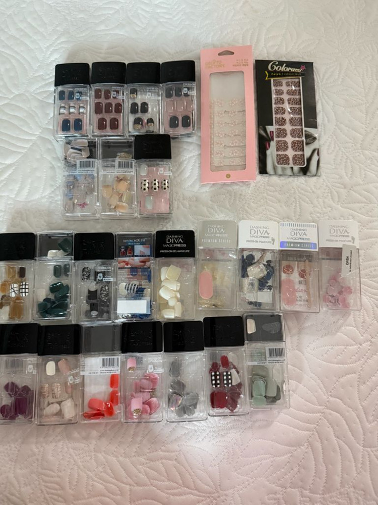 다양한 색상과 디자인의 데싱디바 네일팁들이에요. 새 제품부터 사용감 있는 것까지 여러 종류가 포함되어 있어서 취향에 맞게 골라 쓸 수 있어요. 홈네일 하시는 분들께 좋을 것 같아요! 반값택배 가능 반품 환불 불가