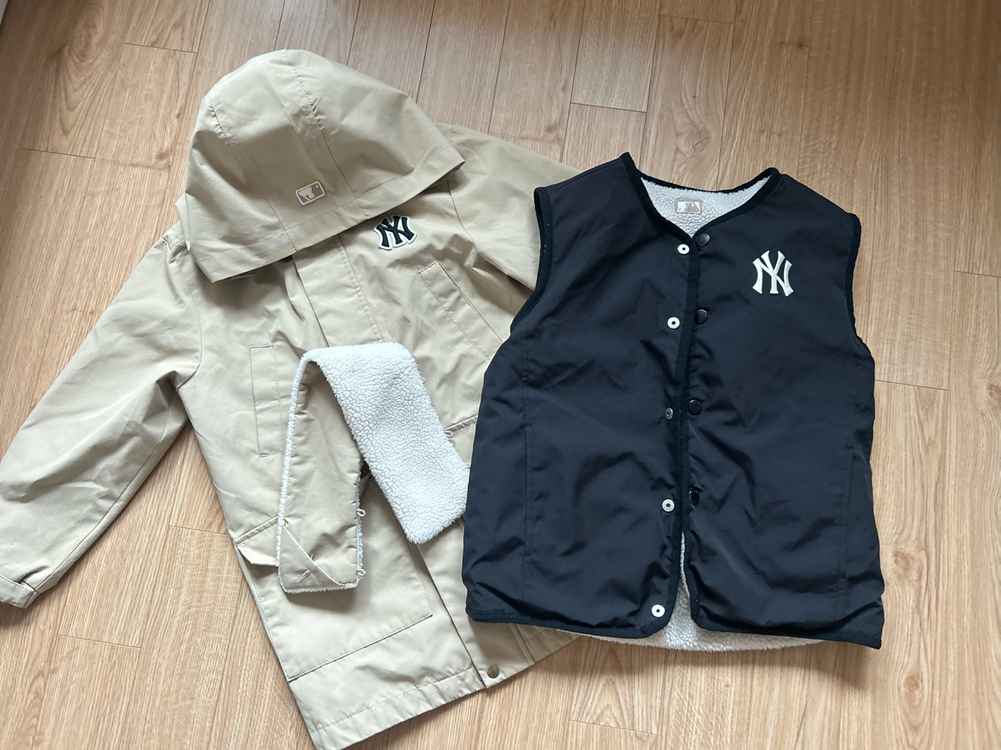 MLB 뉴욕 양키스 바람막이 자켓, 조끼 세트입니다. 베이지색 바람막이 자켓에 검정색 양면 조끼가 한 세트입니다. 자켓,점퍼,바람막이,양털조끼2가지디자인등등 5가지로 전환해서 입을수있구요. 5벌기능을 할수있어요. 넥라인에 양털탈부착 가능하고 모자도 탈부착 말해모해~완전강추~ 고급지게 실속있게 입히세요~ 입으면 완전 귀티나요~ 9Y/130사이즈 반품불가 신중구매하세요. *** 오육일팔 일공일삼