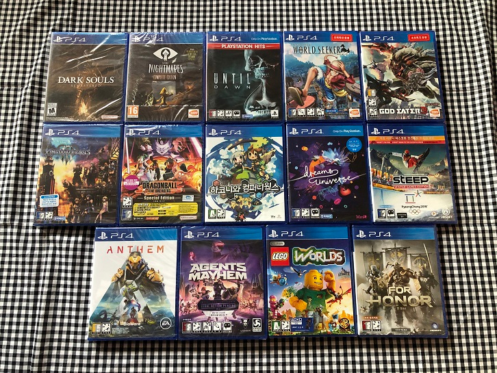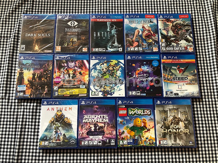 PS4 게임 14개 일괄로 팝니다. ※ 모두 미개봉 새제품 입니다. 소장 목적으로 수집했었던 게임들인데 정리 차원에서 내놓습니다. 문자로 연락주시길 부탁드립니다. ※ 게임 내용에 관한 문의 사절 (게임 제작사나 유통사쪽으로 문의 해 주시기 바랍니다.) ※ 개별판매 문의 사절 (개별판매 문의는 답장이 안갑니다.) ※ 택배거래하며 우체국으로 발송 되세요. (택배비는 +4,000원 입니다!!) ※ 중고나라 앱으로 결제하실 경우 수수료1%가 추가 되오니 결제전 미리 연락 부탁드리겠습니다. 1. 다크소울 리마스터 북미판 2. 리틀 나이트메어 컴플리트 에디션 유럽판 3. 언틸던 4. 원피스 월드시커 5. 갓이터3 6. 킹덤하츠3 7. 드래곤볼 더 브레이커즈 8. 하코니와 컴퍼니 웍스 9. 드림 유니버스 10. 스팁 윈터게임 에디션 11. 앤썸 12. 에이전트 오브 메이헴 13. 레고월드 14. 포아너