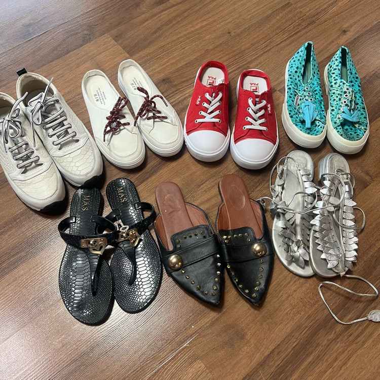 1. 새상품 수페르가 호피단화 230 - 판완⭕️ 2. 골드포인트 뮬 245 - 3000원 유니크하고 독특함 앞코 뾰족이라 엣지 있음 코 부분 까짐 있음 3. 실버 나뭇잎 샌들 240 - 5000원 유니크하고 끈으로 올려매서 신는 스타일 굽 2cm정도에 포인트주기 좋음 안쪽, 끈 가죽 떨어짐 있음 싸게 판매 4. 블랙&골드 쪼리 슬리퍼 240 - 3000원 몇번 안신고 신발장에만 있었음 상태 굳 발가락 사이 많이 안불편했음 적당한 경도 5. 필라 빨강 뮬 운동화 230 - 7000원 상태 아주좋고 귀여운 운동화임 쿠션감 굳 6. 화이트 가죽 뮬 운동화 230 - 5000원 상태 아주좋고 끈이 포인트 인조가죽느낌임 7. 발편한 쿠션감 운동화 240 - 5000원 디자인 깔끔하고 편하게 신기 좋음 쿠션감도 좋음 뒷꿈치 및 안쪽 가죽까짐 있어 저렴