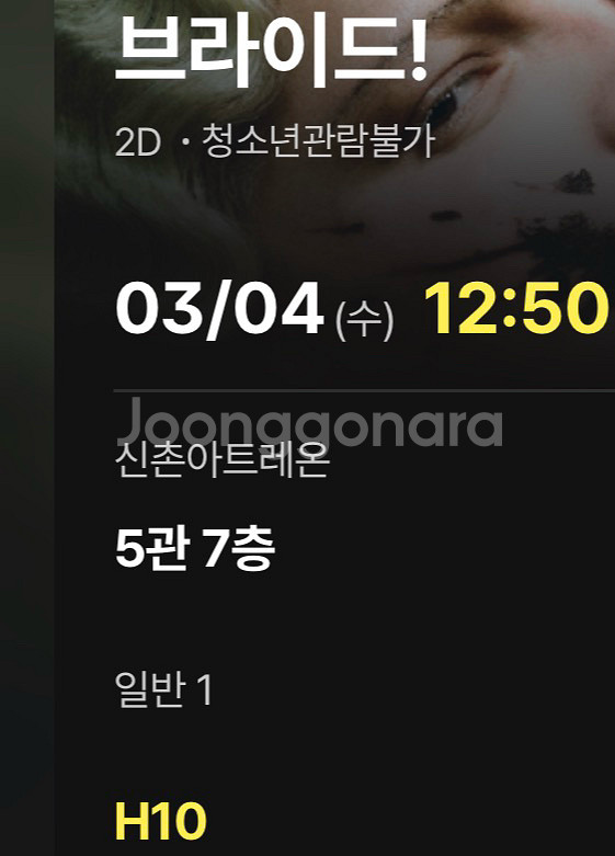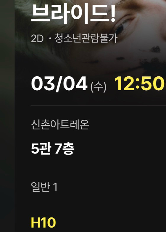3월 4일에 개봉합니다 3월 4일 12시 50분 신촌 아트레온에서 상영하는 영화 브라이드 티켓입니다 5관 7층 H10 좌석입니다 판매 번호 전달합니다 채팅 주세요