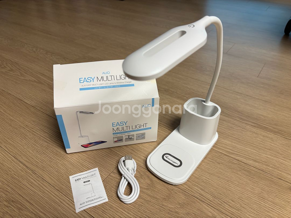 ALIO 이지 멀티 라이트 LED 무선충전기 LED 램프와 무선 충전 패드, 펜꽂이 기능이 있습니다 - 눈부심 방지 기능으로 눈의 피로를 덜어줍니다 - 스마트 기기 무선 충전이 가능합니다 박스에 약간의 스크래치가 있습니다(사진 참고) 작동되는지 확인하느라 불 한번 켜본거 외에는 새제품 입니다