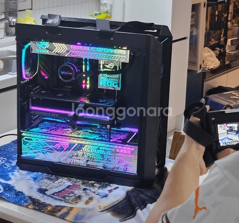 - 다른 플랫폼에 먼저 팔리면 글 내려요 ~ 플랫폼 기준 720만원 + 별도 모딩까지 740만원 가까이 하는 구성입니다. (사진에 보이는 잘만 지지대는 x) - 03월 01일 조립한 하이엔드 PC 입니다. ㄴ 부품 모두 국내 정품으로 구성되어 있으며, AS 기간 모두 빵빵하게 남아있습니다. - 03월 02일 테스트 완료했습니다. ㄴ 3D Mark, 시네벤치, 윈도우 메모리 검사, 모두 이상 없습니다. - 각종 드라이버 설치 해놨으므로 연결하여 바로 사용하시면 됩니다. - 윈도우는 로컬 계정으로 받아 놓았으므로 윈도우11 홈 정품 미개봉 동봉해서 드리니 직접 정품키 입력하여 등록하시면 됩니다. □ CPU - AMD 라이젠 7-6세대 9850x3D ㄴ 국내 정품 (유통사 : 대원씨티에스) ㄴ *2025년 49주차 생산* {2028년 49주차 까지 워런티} □ 메인보드 - ASUS ROG STRIX B650E-E 게이밍 WIFI ㄴ 국내 정품 (유통사 : STCOM) ㄴ *2028년 08월 29일 까지 워런티* □ 메모리 - 지스킬 DDR5-6000 CL36 32GB(16x2) ㄴ 국내 정품 (유통사 : 서린씨앤아이) ㄴ *Limited Lifetime (제한적 평생 워런티)* □ 그래픽카드 - ASUS ROG Astral 5080 OC D7 16GB ㄴ 국내 정품 (유통사 : 인텍앤컴퍼니) ㄴ *2029년 12월 20일 까지 워런티* □ 저장장치(메인) - 삼성전자 990 PRO 1TB ㄴ 국내 정품 (유통사 : 삼성전자 서비스) ㄴ *2029년 11월 까지 워런티* □ 저장장치(서브) - Western Digital Blue SN5100 2TB ㄴ 국내 정품 (유통사 : 삼아소이전자) ㄴ *2030년 11월 16일 까지 워런티* □ 쿨러(3열 수냉) - 발키리 GL360 ARGB (블랙) ㄴ 국내 정품 (유통사 : 다산코퍼레이션) ㄴ* 2030년 말까지 워런티* □ 파워 (ATX 3.1) - ASUS ROG STRIX 1200W Platinum ㄴ 국내 정품 (유통사 : 대원씨티에스) ㄴ *2035년 06월 19일 까지 워런티* □ 케이스 - ASUS ROG STRIX HELIOS ㄴ 국내 정품 (유통사 : 대원씨티에스) ㄴ *2028년 02월 12일 까지 워런티* □ 소프트웨어 - 마이크로소프트 윈도우 11 HOME FPP ㄴ 국내 정품 (유통사 : 인텍앤컴퍼니) ㄴ 메인보드 귀속 DSP x / 이전 가능한 FPP □ 기타 - 케이스 팬 교체 (4EA) ㄴ MONTECH RX140 ARGB - ID-COOLING ABF-AM5 데이븐 가이드 □ 커스터마이징 - ROG STRIX HELIOS 새시 모딩 (미러 LED) - 지스킬 LED 바 모딩 (보석바) " 현존하는 최강 게이밍 CPU 9850x3D , 메인보드 + 그래픽카드 + 파워 + 케이스 등 아수스 ROG 에디션으로 구성하였고 별도로 케이스 새시 미러 모딩 구성하였습니다. 그래픽카드는 유명한 아스트랄이고, 파워도 빵빵하게 1200W 플레티넘이라 추후에 업그레이드에도 문제 없습니다, 메모리도 별도로 보석바 모딩 해놨으며, 국민램 6000 속도로 EXPO 적용 가능합니다, SSD 디램 탑재 990 PRO 1테라 및 SN5000 후속 SN5100 2테라 쾌적한 용량으로 사용 가능합니다 " " 기본 견적 구성으로만 720만원이 넘으며, 별도 미러 모딩까지 740만원 가까이 합니다. 5090 제외하고는 사실상 게이밍 영역에서 최강이며, ASUS ROG 감성으로 눈도 만족 시키는 구성입니다 ~ (내부 우측 빈 공간은 별도로 디스플레이 설치 하실 수 있게 비워놓았습니다) " □ 구매 진행 시, 예약금 받습니다. - 갑작스러운 취소/노쇼 방지를 위해 예약금 5만원 받습니다, 거래 진행 시 차감하고 거래 진행해요 ~ - 업자가 아니고 개인이 조립한 PC로서 초기 불량 이상만 확인하므로 추후 발생하는 하드웨어 문제는 케어가 불가하오니 참조 부탁드립니다. ㄴ 단, 소프트웨어 윈도우는 등록 불가 오류가 종종 있어서 기존 제품 수거하고 새로 구매해서 드립니다. ㄴ AS 불가한 직구나 만료된 제품들이 아닌 전부 국내 정품이며 AS 기간 빵빵하게 남아 있으므로 유통사 케어 가능합니다. ㄴ 전자제품 특성상 환불 불가하니 신중하게 구매 요청 주시면 감사하겠습니다 ~ □ 파손 위험으로 배송 불가 - 매우 매우 무겁습니다...;; - 평일은 직접 픽업하셔야 하며 주말은 미리 요청주시면 서울/경기 지역은 직접 가져다 드릴 수 있으니 말씀 주세요 ~
