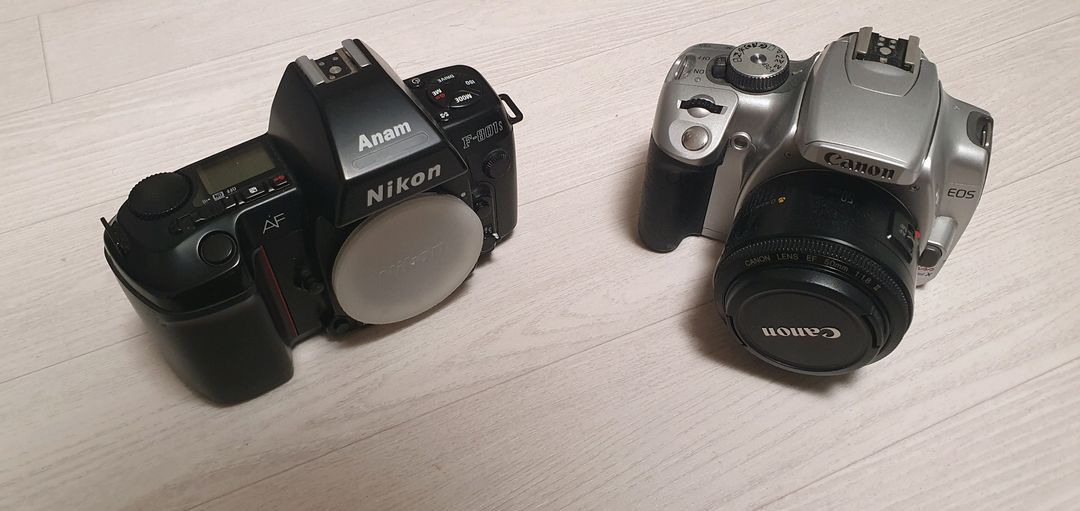 니콘 F-801s 는 필름 카메라입니다 전자식이 아니라 필름을 넣고 구식으로 찍는 예전방식(?)의 카메라입니다. 사진이 옛날 감성으로 나오며 필름을 직접 사진관에서 현상해야하기에 그만큼 입문하기 어렵습니다 전반적으로 상태 양호한편이나 배터리 뚜껑이 깨져서 테이프로 고정해서 써야합니다 캐논 eos 400d는 dslr 카메라입니다 디지털식미라서 폰카처럼 누르면 찍힙니다 cf메모리에 사진이 디지털로 저장되고 컴퓨터에서 확인 가능합니다 eos 400d는 사용에 아무 문제 없습니다 f-801은 카메라 본품만이며 eos-400d에는 캐논 정품 렌즈 ef 50mm 가 장착되어 있습니다. 렌즈 역시 같이 드립니다. 카메라 입문해보고 싶다 하시는 분들께 아주 좋은 초 가성비 이득 가격입니다. 검색해보시면 아시겠지만 각각 바디값, 렌즈값만 따로 팔아도 이득이십니다. 입문에 처음부터 비싼 장비 구매하지마시고 이걸로 시작해보시고 괜찮다 싶으실때 비싼걸로 사시면 되겠습니다. 저도 입문하려고 각각 따로 구매한 것이나 저는 잘 맞지 않는다는걸 알게되어 제가 따로 구매한 가격들보다 훨씬 저렴하게 같이 넘겨드립니다 직거래시 간단한 사용법 알려드릴 수 있습니다 양재동 스타벅스 근처 빌라에서 직거래 혹은 일택 반택 가능합니다