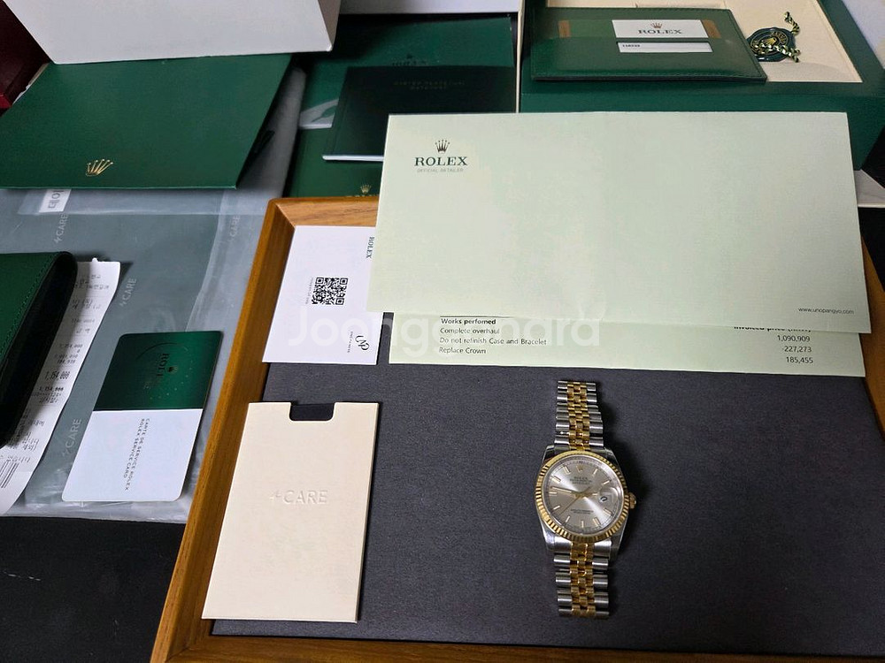 116233입니다 17년도 스템핑 구성품 풀코(장착중) 박스 쇼핑백 보증카드 책자? 등 다 있습니다 히든버클 ,인그레이빙o , 17년식 , 26년 정식 오버홀 메리트 있다 생각합니다 중고명품시계 매장에서 번개케어로 구매하였고 구매후 연식 생각해서 오차 및 용두 나사산 마모 방지 위해 정식 매장에서 오버홀과 용두교체 하였고 (비용 110만원 이상 발생 영수증 포함) 폴리싱은 불필요해보여 굳이 진행하지 않았습니다. (평소 폴리싱을 선호하진 않습니다. 새제품처럼 착용하실거면 하셔도 되지만 개인적으로 아직 깨끗한 상태라고 보여집니다.) 컨디션은 찍힘 없고 생활기스 어느정도 있지만 폴리싱으로 다 지워질 정도 입니다 (오래 착용하시다가 한 번 받으시면 될 듯 합니다) 기능상 컨디션은 정식 오버홀 최근 했으니 걱정 안 하셔도 될 것 같습니다. 금액은 계속 오르니 안 팔리면 소장할 예정입니다. 구매한 가격과 오버홀 금액도 있고하니 네고는 안 받겠습니다. 교환은 같은 롤렉스만 받겠습니다. (어느정도 추금 오가는 정도 괜찮습니다.)
