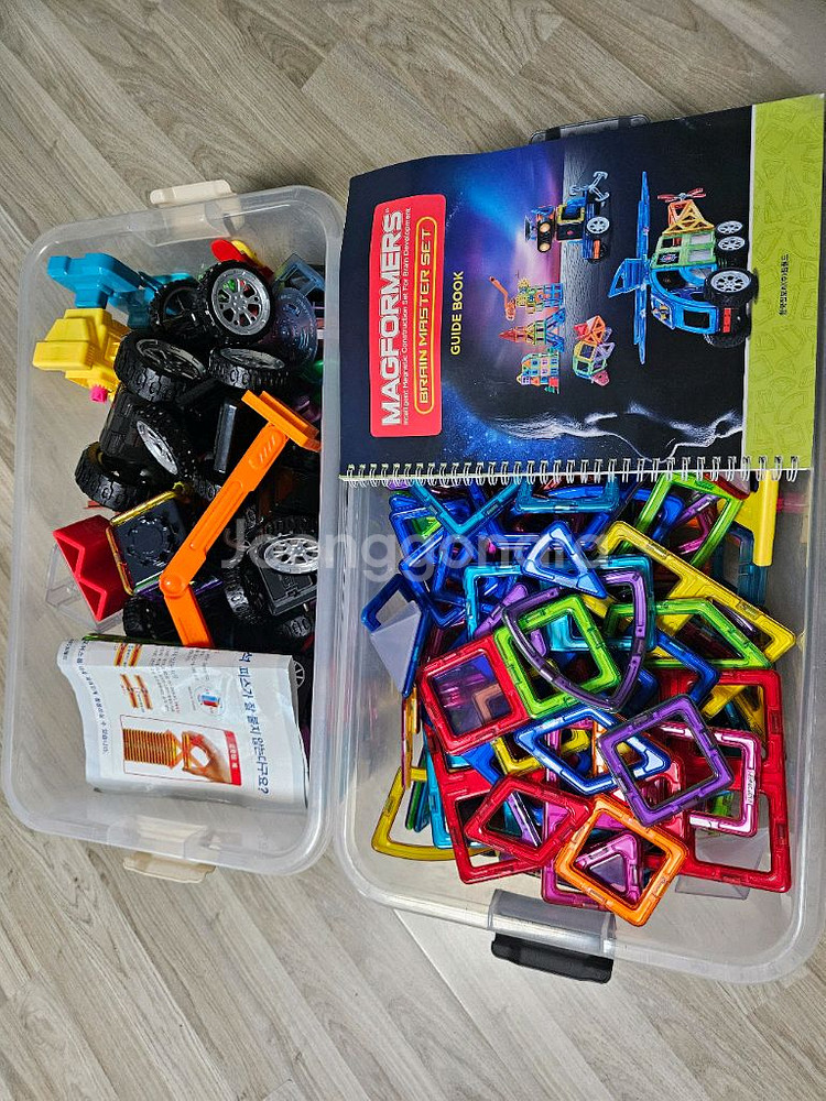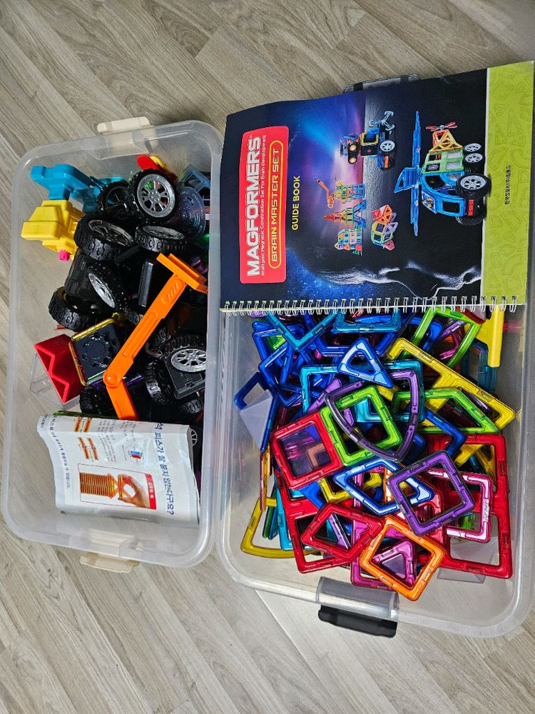 자석 블록과 설명서가 포함된 완전한 세트예요. 다양한 모양의 자석 블록들이 깔끔하게 정리되어 있고 상태도 양호합니다. 창의적인 놀이와 학습에 정말 좋은 교구입니다!