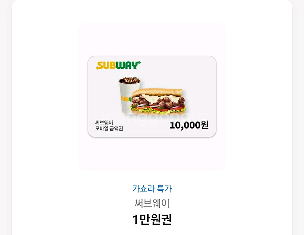 ** 모든제품 핀번호 노출 후 교환 연장 환불 불가** ◇ 써브웨이 1만원 모바일금액권-9400원 (1개 보유) 3/31 잔액관리 가능 ■ 이용안내 - 결제 시 모바일 쿠폰을 제시해주세요. - 권면가액 이상 구매 시 현금/카드 등 추가 결제하여 사용 가능합니다. - 모바일 금액권 중복 사용 가능합니다. - 사전에 고지된 일부 이벤트에 한하여 모바일 상품권 사용이 제한될 수 있습니다. - 매장 방문 시에만 사용 가능합니다. - 사용 금액에 대한 현금영수증 발행 가능합니다. - 모바일 상품권 결제에 따른 포인트 적립은 브랜드사 정책을 따릅니다. * 현금으로 교환 및 환불이 불가합니다. * 분할 사용이 가능하며 남은 잔액은 다시 사용하실 수 있도록 저장됩니다. ** 모든제품 핀번호 노출 후 교환 연장 환불 불가**