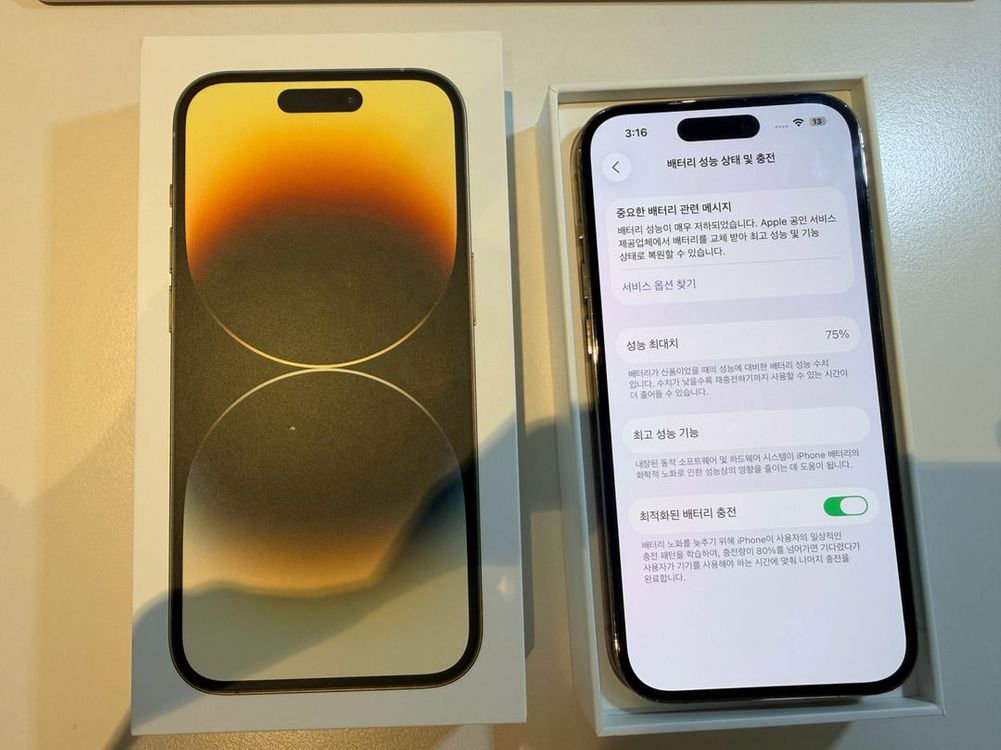 아이폰14프로 256기가 골드 자급제 폰 국내 애플스토어 정품 모델로서, 배터리 성능 최대치 약 75 안팎입니다. 최근 화면 교체했습니다. 조심스럽게 써서 상태 좋습니다. 모델번호는 A2890 입니다. 박스 등 있으며 원하시면 케이스도 하나 드릴게요.