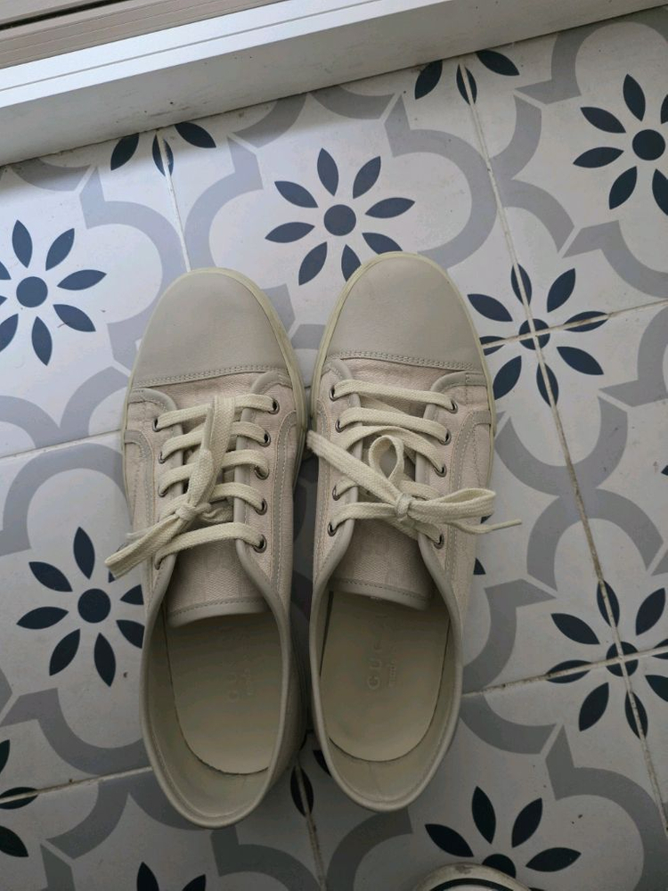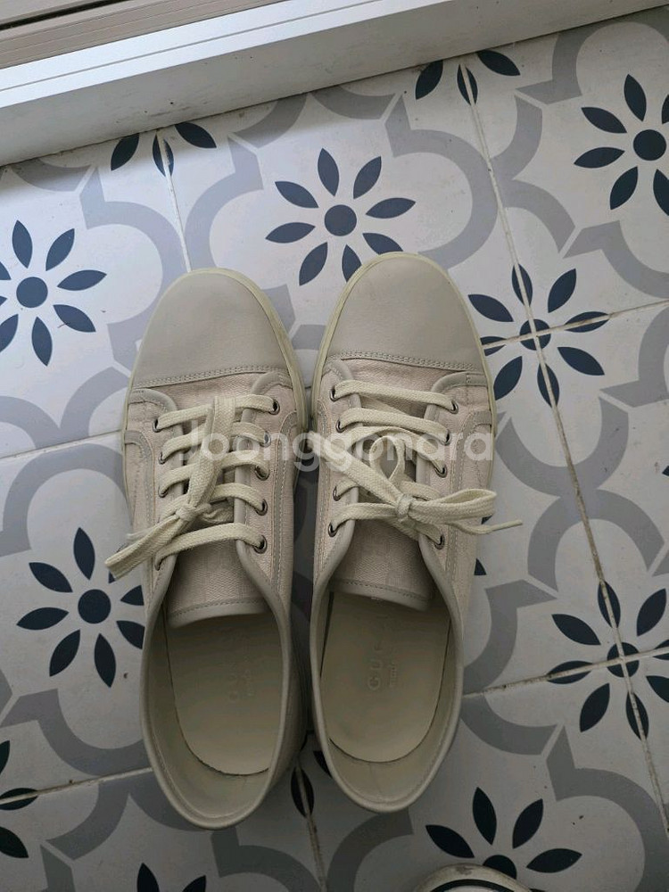 정품 베이지 컬러 스니커즈예요. 구찌 패턴이 들어간 깔끔한 디자인으로 상태도 양호합니다. 실용적이면서도 고급스러운 아이템이라 추천해요!