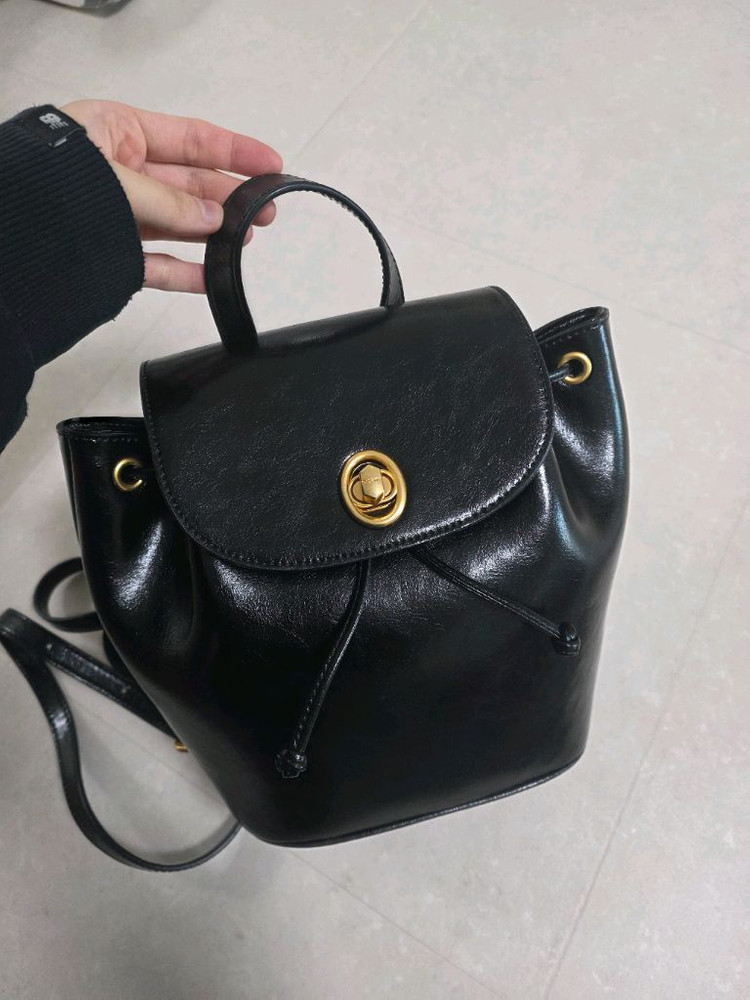 오야니 블랙 가죽 미니 백팩이에요. 골드 로고 포인트가 고급스럽고 더스트백도 함께 있어서 보관이나 선물용으로도 좋을 것 같아요. 상태 양호한 중고 제품입니다.
