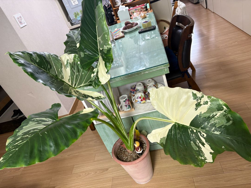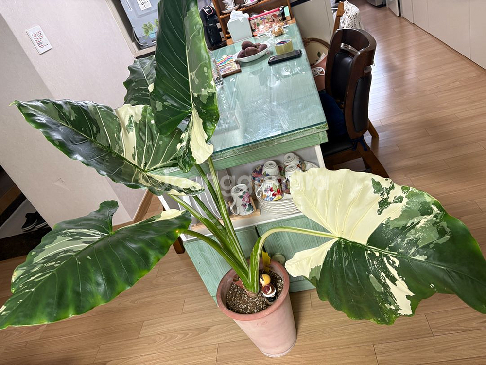 잎에 크림색과 화이트 무늬가 아름다운 알로카시아 바리에가타예요. 건강한 상태로 잘 자라고 있어서 키우기 좋을 것 같아요. 실내 인테리어용으로 정말 예쁜 식물입니다! 컨디션 좋습니다 강원도 춘천직거래 원합니다