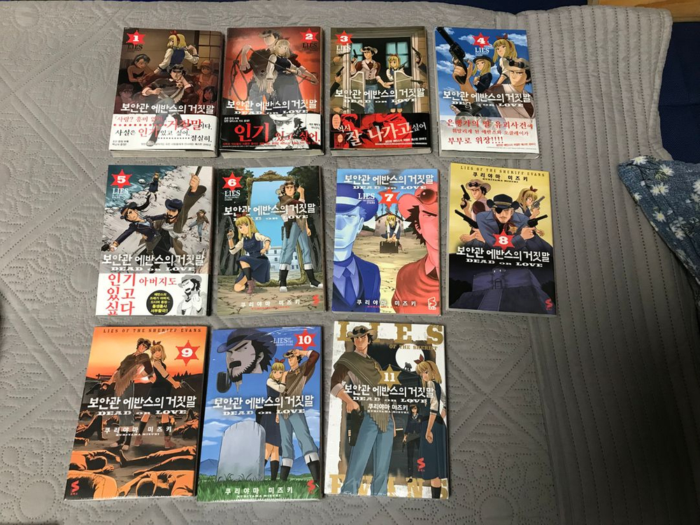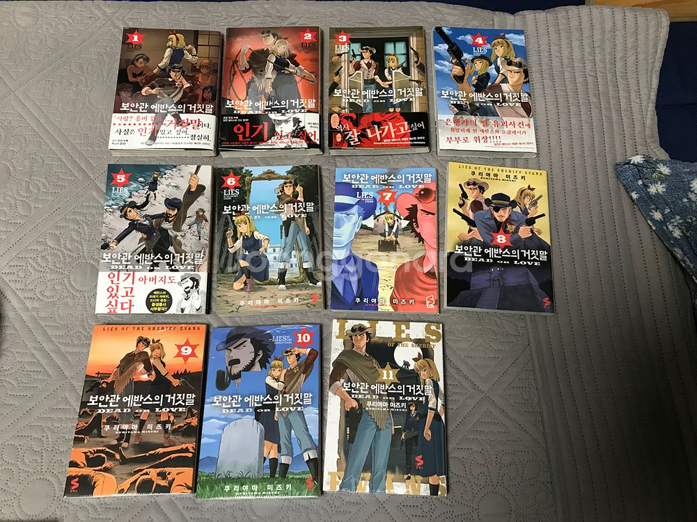 소장용 절판 만화 만화책 코믹스 보안관 에반스의 거짓말 1~11권 올초판 초판 판매합니다. 전권 초판이며, 현재 대부분 절판, 품절 상태인 희소 서적입니다. 1~8권 개봉. 9~11권 미개봉. 개봉한 서적들도 전권 직접 새 책 구매 후 비닐만 뜯고 한 번도 읽지 않고 책장에 보관만 했습니다. 초판 특전과 띠지도 모두 그대로 있습니다. 참고로 원래부터 5권까지만 초판 특전과 띠지가 존재합니다. 다만 1~2권 책 윗면 종이 부분에 세월의 흐름으로 황변이 있고, 1권 겉표지 책등 약간 찌그러짐과 뒷표지 하단 부분, 앞표지 모서리 부분에 사진과 같이 약간의 구겨짐이 있습니다. 겉표지 책등 살짝 찌그러진 것도 사진 참고 부탁드립니다. 모두 서점 구매 때부터 있었던 자국들입니다. 택비는 별도 6천원입니다.