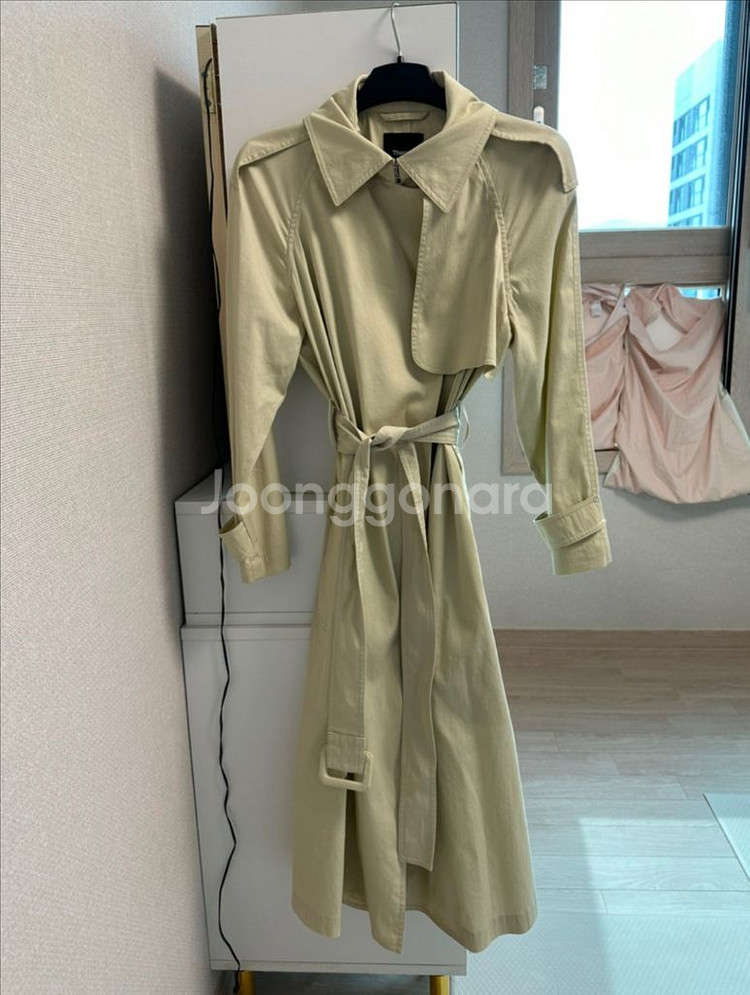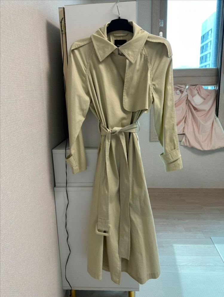 띠어리(Theory) 트렌치코트(P) 연한 라임색 같은 색상이에요 롱하게 일자-세미A라인으로 떨어지고 단추는 없고 목 부분에 버클로 채울 수 있고 스트랩으로 허리에 맞춰서 라인 들어가게 입을 수 있어요 안감은 따로 없고 살짝 부드럽게 바스락 거리는데 구김은 많이 안 가요 손목과 어깨 견장은 붙어있어서 뗄 수 없어요 뒷트임은 없고 디자인으로 들어가 있지만 활동하는데 불편하진 않아요 어깨는 나그랑이에요 소매 기장 수선 조금 했어요 가슴단면50 기장 113.5 에눌 교환 환불 안 됩니다