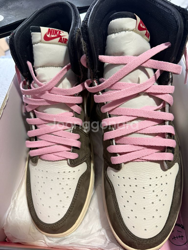 나이키 에어 조던 1 트래비스 스캇 하이제품입니다 크림에서 구매한 새제품입니다 운동화끈을 핑크로 바꾼후 케이스에 보관만했습니다 제가 하이보단 로우제품들을 좋아해서 하이를 잘 신지않아서 보관만해왔습니다 크림보다 많이 저렴하게 판매합니다