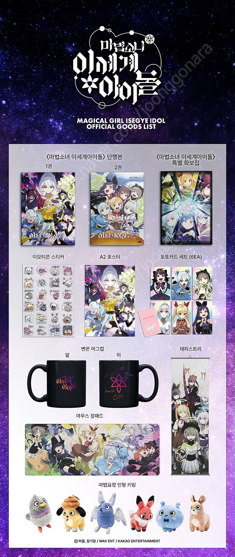 ※ 카페 상품 게시글은 자동으로 중고나라 앱/사이트에 노출합니다. 노출을 원하지 않으실 경우 고객센터로 문의 바랍니다. ※ 등록한 게시글이 회원의 신고를 받거나 이상거래로 모니터링 될 경우 중고나라 사기통합조회 DB로 수집/활용될 수 있습니다. ─────────────────── 📢 제목에 "제조사/ 브랜드 명"과 "상품명”를 넣어 작성하면, 보다 빠른 판매가 가능합니다! 📢 게시글 작성 시 배송 방법에 “직거래”와 “내 위치” 설정할 경우, 보다 빠른 판매가 가능합니다! 텀블벅<마법소녀 이세계아이돌> 단행본 & 스페셜 공식 굿즈 분철해봐요~ 배송은 물건 받고 5일 내로 가능합니다~ - 단행본1,2권+화보집+스티커+포스터 : 6만 (기본 지류박스 추가 시 12만) - 달성률 특전 (북마크, 색지, 계약서) : 일괄 4만 - 포토카드 : 개별 시 각 2만, 세트 10만 - 올인원 엽서 : 개별 시 각 1.5만, 세트 6만 - 머그컵 : 4만 - 태피스트리 : 4.5만 - 장패드 : 6만 - 키링 둘기 : 6만 - 키링 세규니 : 4.5만 - 키링 똥강이, 배트, 라니 : 4만 - 키링 려우 : 각 3.5만 즉입이나 별도 예약금 걸거 아니면 문의마세요~ 안전결제, 네고 안받고 입금 후 환불 불가니 유의하고 채팅주세요~
