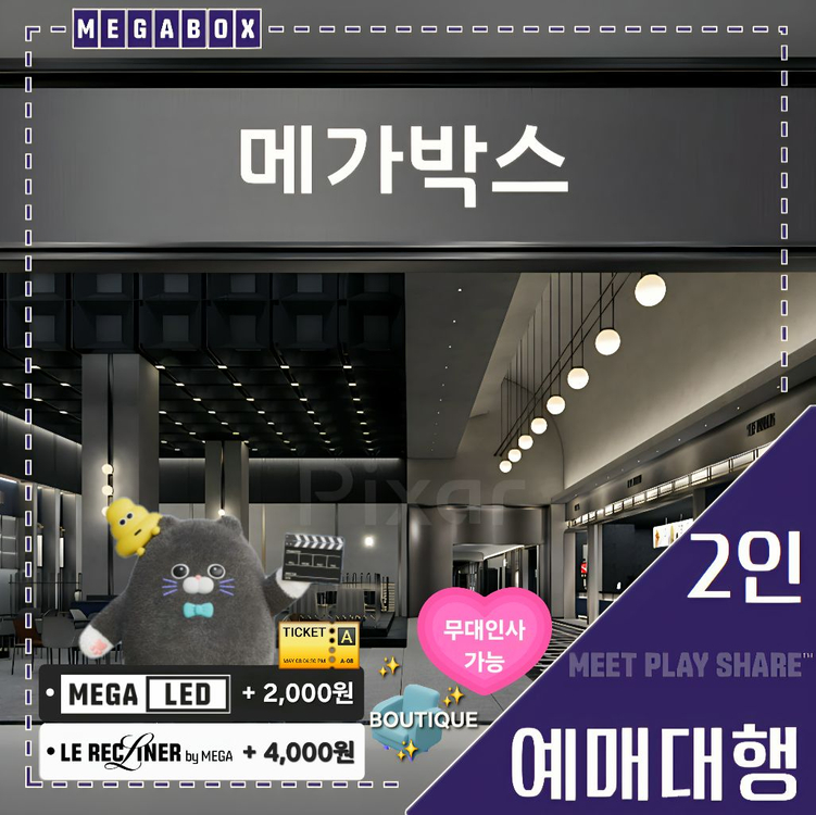 2D 영화 일반 상영관[일반석, 컴포트, 더 부티크(스위트 불가), 리클라이너, LED관, 르 리클라이너관] ★ 영화 외 기타 콘텐츠(강연, 클래식, 공연물 등)와 일부 상영관은 예매나 할인이 불가할 수 있습니다. 원활한 예매를 위해 상영 시작 최소 40분 전 영화로 문의 주세요. ★ 예매 원하시는 분은 아래 예매 필수 정보를 참고하여 중고나라 앱(카페 앱 X)으로 챗 주시면 선예매 해드립니다. ✔️ 예매 필수 정보 : 영화명 / 극장명 / 날짜 / 시간 / 좌석 선택 (조조, 문화의 날 불가) ※ 예시 : 우리는 매일매일 / 코엑스 / 03.10 / 20:25 / E09, 10 * 판매가 : 21,800원(리클라이너/부티크/컴포트/일반석, 평일 및 주말 동일 2인) ▪︎ MEGA LED | LE RECLINER 2인 • LED : 23,800원(2인) • 르 리클라이너 : 25,800원(2인) 🍀 월 / 화 추가 할인(단 할인권 재고 보유 시) - LED : 22,500원(2인) / 르 리클라이너 : 24.0(2인) * 관람료가 28,000원 이하 극장은 20,000원(2인)에 예매 가능하니 문의주세요. (단 할인권 재고 보유 시) * 판매가는 상황에 따라 추가 할인이나 변동될 수 있습니다. - 분당점 예매 시 콤보 50% 할인권 드림(🍿🥤) - 광주상무점 예매 시 에이드콤보 5,000원 할인권 드림 * 예매번호 기본 챗 전송(원하시면 문자 가능) ------------------------------------------------- 언제나 그렇듯 신속하고 정확한 신용거래(성사율 100%) 약속드립니다. [예매번호 전송 후 취소 환불 불가 / 현장 임의 취소 동일] 무통보 입금 지연 시(10분 경과)와 응답이 늦는 경우 거래 취소하는 걸로 간주합니다. [판매완료] 표시가 되기 전까지 이 글은 유효(판매중)입니다. 계좌 수집, 찔러보는 구매자(네고 & 교환) 절대 사절합니다! [비매너 구매자 차단] 3~5분 이내 빠른 발권 보장하며 동시 거래 중인 경우 발권 시간이 약간 지연될 수 있습니다. 네트워크 상황에 따라 실시간 채팅 확인이 다소 늦을 수 있으니 잠시 기다려 주세요. (5분 미만, 단 접속 시에 한함)