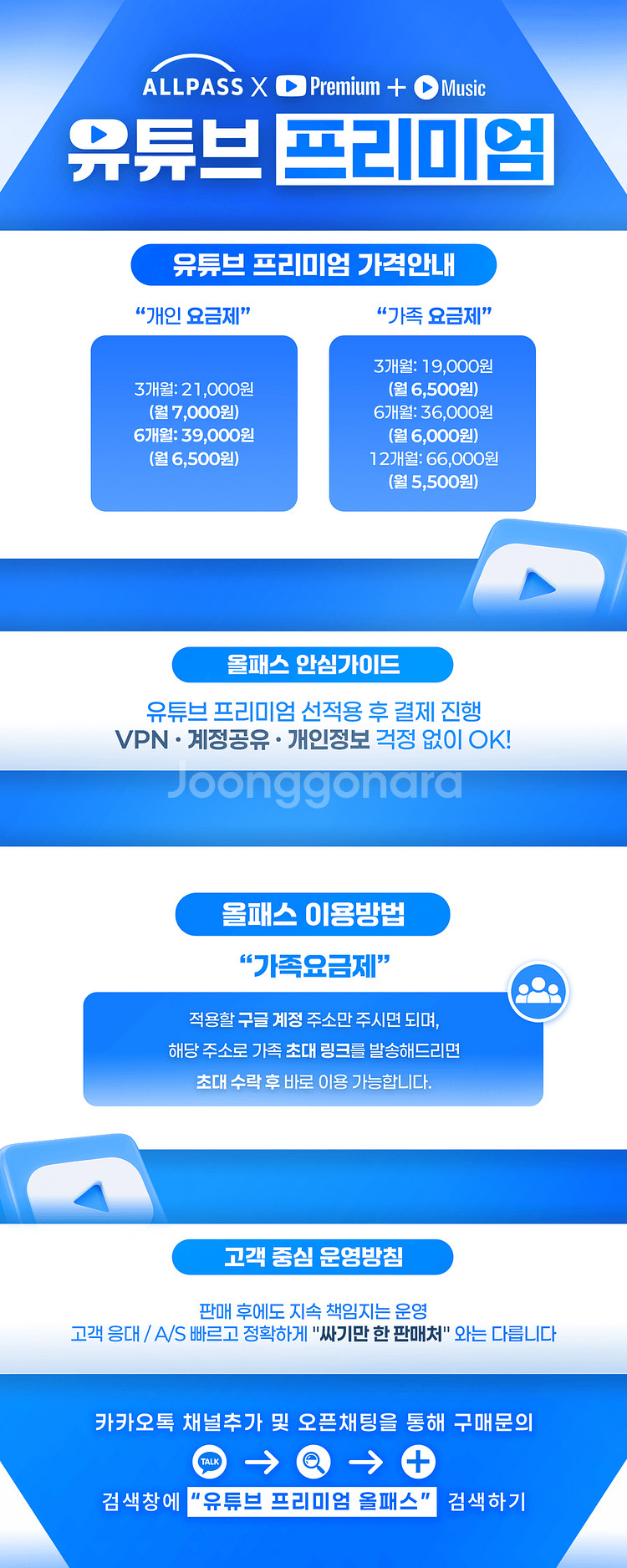 유튜브 프리미엄+뮤직 판매 후에도 계속 책임지는 운영! 고객 응대, A/S 빠르고 정확하게 “저렴하기만 한” 판매처와는 다릅니다 구매 문의는 게시된 이미지 '하단' 참고 부탁드립니다! 깨톡: 유튜브 프리미엄 올패스 <-- 검색하셔도 ㅋrㅋr오 채널 나옵니다.! 후기도 많으니 꼭 들려서 고민되시면 후기 보고 판단하세요! 가족요금제 3개월: 19,500원 6개월: 36,000원 12개월: 66,000원 개인요금제 3개월: 21,000원 6개월: 39,000원