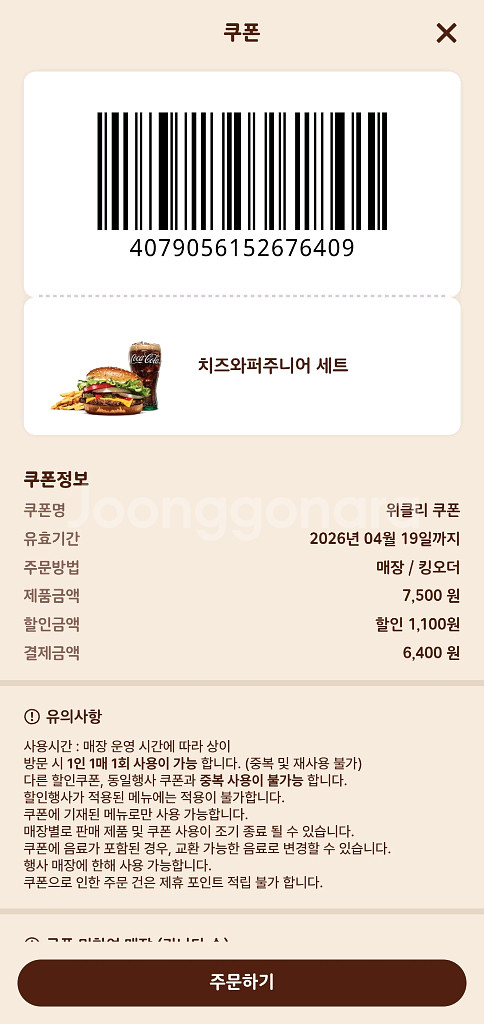 개인정보(거래정보)를 주고받는 행위는 사기에 노출될 수 있으므로 즉시 중고나라로 신고해 주세요버거킹 와퍼 단품/세트 할인쿠폰 사용기한 260419 일요일까지 쿠폰 쓰셔서 할인받아서 드시고 적립만 꼭 부탁드려요 원하시는거 그냥 바로 사용하시고 쿠폰 쓰셨으면 다른분들 위해서 쓰셨다고 채팅 한번만 부탁드려요 사용된건 내리겠습니다 맛있게 드세요!