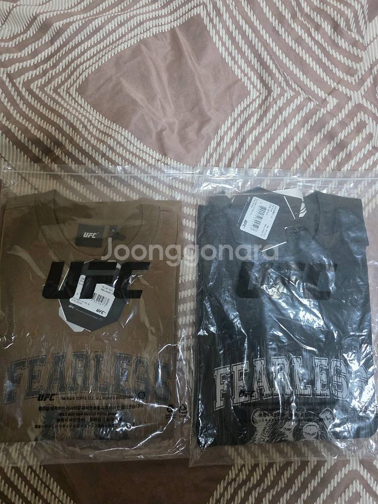 UFC 로어베어 반팔티셔츠입니다. 브라운과 블랙 2가지 색상이며 세트로 일괄 판매합니다. 브라운은 XL, 블랙은 2XL입니다.(국내사이즈로 XL는 105, 2XL는 110정도) 미개봉 상태의 깨끗한 새 옷입니다. 쿨거래 하시면 택배비 무료입니다. 직거래 가능지역은 화성시 동탄구입니다. 의류 특성상 구매 이후 반품이나 환불은 불가합니다!