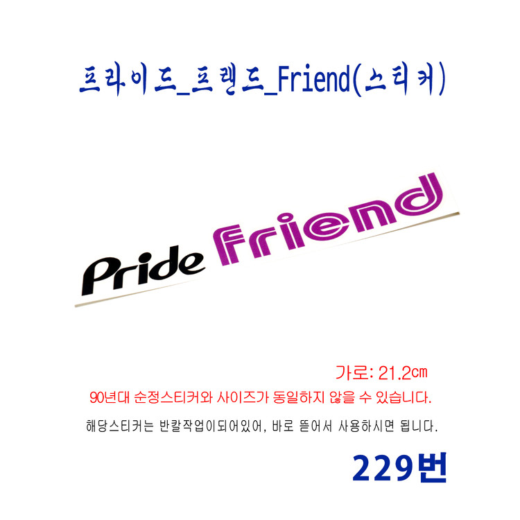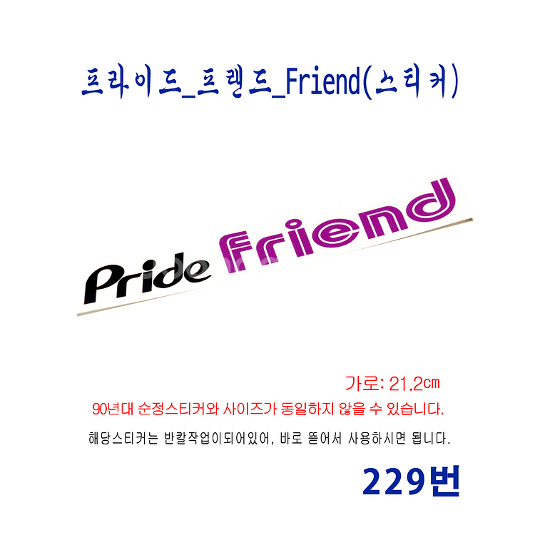 - 제품명: (229번) 프라이드_프랜드_Pride Friend(스티커) 올드카를 사랑하는 취미 활동의 일환으로 극소량 수작업으로 제작되는 복각 제품입니다. 대량 생산이 불가능한 제작 방식 특성상 주문 후 제작 및 발송까지 최대 1일~3일 정도 소요될 수 있습니다. ■ 주문 및 결제 안내 여러 종류의 상품을 다양한 수량으로 주문을 원하실 경우, 먼저 채팅을 통해 품목과 수량을 안내해 주시기 바랍니다. 상담 후 주문 내용을 확인하여 맞춤형 번개페이 전용 구매창을 별도로 생성해 드립니다. 맞춤 구매창 생성 이후에는 해당 구매창을 통해서만 결제 가능하며, 결제 완료 후 제작 및 발송이 진행됩니다. ■ 배송 안내 주문건당 묶음배송이 가능합니다. 여러 상품을 구매하실 경우 장바구니에 함께 담아 주문해 주시면 택배비 3,400원만 추가 결제하시면 됩니다. 제주 및 도서·산간 지역은 착불 배송으로만 진행됩니다. ※ 해당 지역에서 선불로 결제하실 경우 주문이 취소될 수 있습니다. ■ 수공예 복각 제품 안내 (엠블럼) 본 제품은 복각으로 제작된 수공예 제품으로, 기성 양산 제품과 비교 시 마감이나 완성도가 다소 떨어질 수 있습니다. 순정 제품(스티커 포함)과 치수·디자인이 완전히 동일하지 않을 수 있습니다. 모든 복각 엠블럼은 후면 EVA폼 양면테이프 작업이 되어 있습니다. 모든 복각 엠블럼은 베이스 : 유광 블랙 아크릴 / 글자 : 회색 무광 포맥스로 제작되었습니다. ※ 일부 제품은 포인트로 컬러 포맥스 또는 도색이 적용됩니다. 레이저 가공 특성상 그을음 흔적이 남아 있을 수 있습니다. 모든 복각 엠블럼은 아크릴 전용 본드로 고정 작업되며, 제작 특성상 일부 본드 자국이 보일 수 있습니다. 모니터 환경에 따라 실제 제품과 색상 차이가 발생할 수 있습니다. ■ 내구성 관련 유의사항 [마즈다 121] / [프라이드 베타] / [얇은 외곽 테두리] 등 글자 크기나 형태가 매우 세밀하게 제작된 엠블럼의 경우, 본드 마감 면적이 극히 작아 외부 충격이나 환경 요인에 의해 글자 들뜸 또는 파손이 발생할 수 있습니다. 구매 및 장착 시 이 점을 반드시 유의해 주시기 바랍니다. ※ 분실 보완 안내 엠블럼 중 포맥스 글꼴(문자·형태) 사용 중 탈락 또는 분실이 발생한 경우, 해당 사진을 보내주시면 1회에 한하여 분실된 글자(또는 형태) 부분을 무상으로 추가 발송해 드립니다. (※ 택배비는 착불 처리됩니다.) ■ 스티커 제품 안내 모든 스티커는 단순 스캔 방식이 아닌, 실물 샘플을 기반으로 디자인을 최대한 복원한 후 CAD 도안 작업과 그래픽 후가공을 거쳐 고해상도로 제작됩니다. 출력은 전문 스티커 제작 업체에 별도 의뢰하여 진행되며, 완성도와 내구성을 고려한 공정으로 제작하고 있습니다. 스티커는 각각 낱장으로 재단되어 배송될 수 있습니다. 유포 스티커 또는 투명 스티커 용지를 사용하여 물에 강하며, 유광 또는 무광 코팅을 추가 적용하였습니다. 반칼 작업이 되어 있어 바로 떼어 사용하실 수 있습니다. 모니터 환경에 따라 실제 제품과 색상 차이가 발생할 수 있습니다.