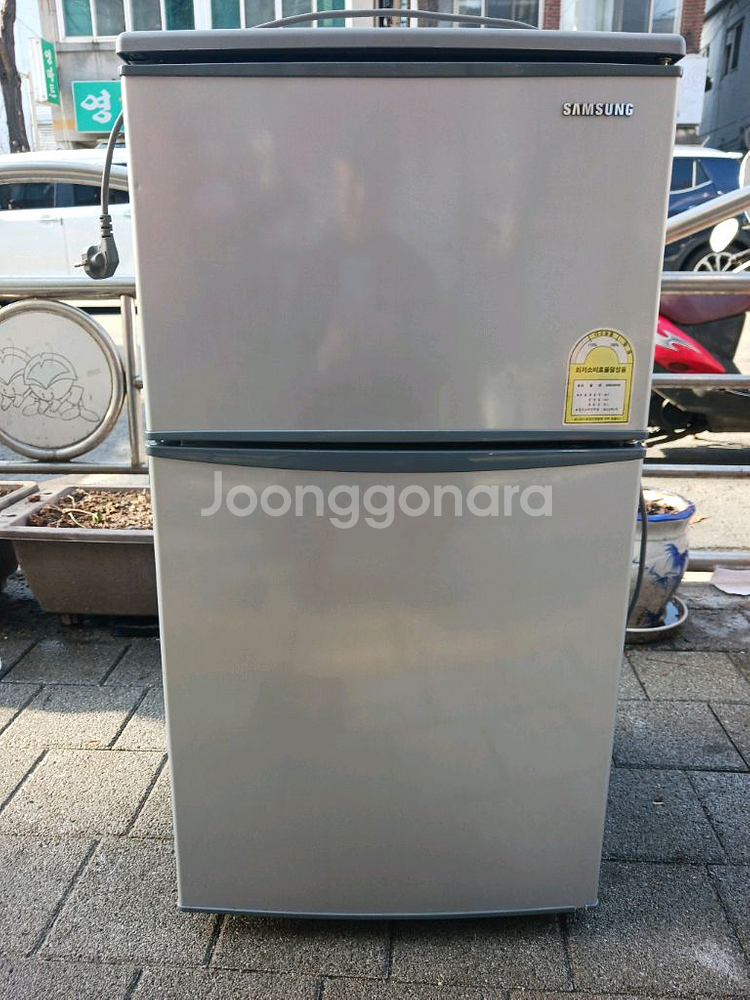 삼성2도어 냉장고예요. 실버 컬러로 깔끔하고 상태도 양호해 보입니다. 주방에서 바로 사용 가능한 제품이에요. 문의 삼일구삼 칠칠오팔