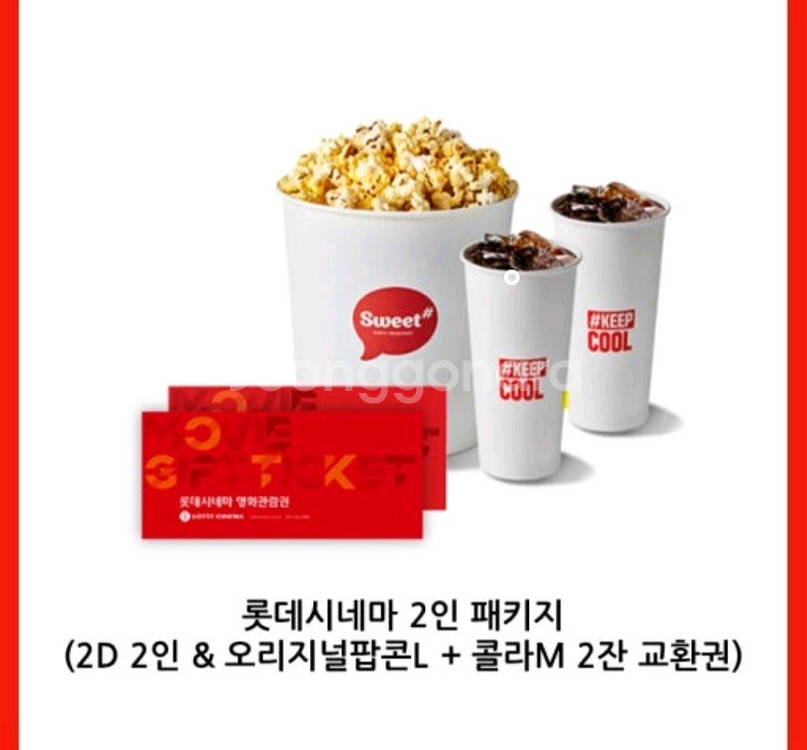 롯데시네마 1인 영화관람권: 10,000원 롯데시네마 스위트콤보(팝콘+음료2): 9,500원 롯데시네마 2인 패키지(표2장+콤보): 29,000원 1. 유효 기간: 2026년 5월 31일 2. 2D 일반관에서 사용 가능하며 특별관은 추가금이 발생 됩니다. 자세한 내용은 아래 유의사항을 참고부탁드립니다. *자주 묻는 질문* 1. 평일, 주말 공휴일, 당일예매 모두 가능합니다. 2. 스페셜관에서 관람 시 추가금이 발생 됩니다. (수퍼플렉스, 수퍼LED, 광음시네마, 리클라이너, 수퍼MX4D 수퍼4D, 씨네패밀리, 씨네커플)